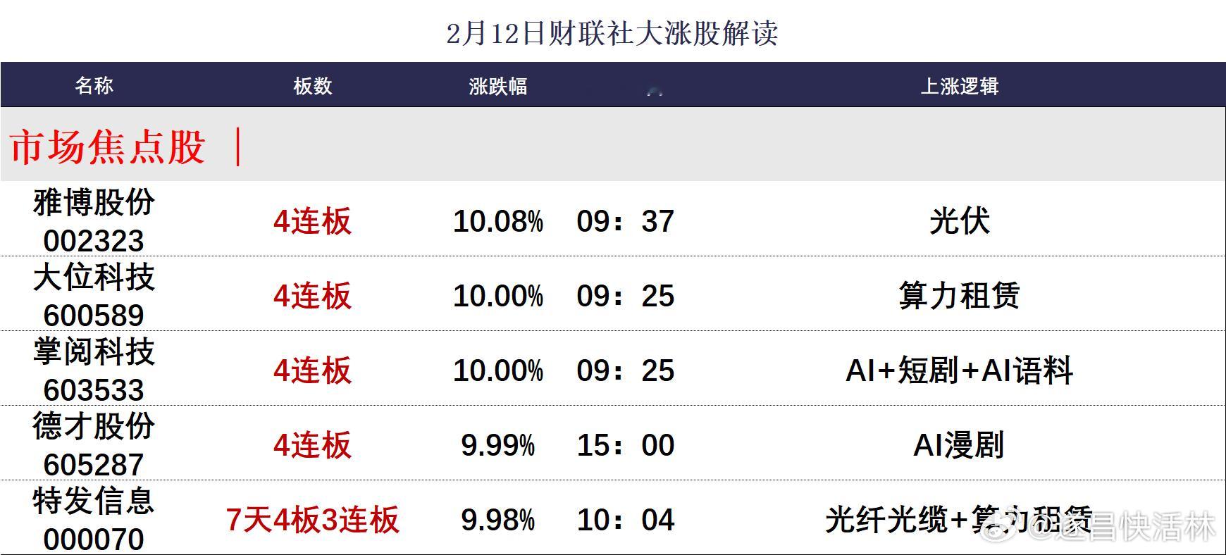 财联社2月12日讯,今日60股涨停,19股炸板,封板率为76%,大位科技、德才股份、掌阅科技、雅博股份4连板,特发信息7天4板。三大指数集体收涨,创业板指、科创50指数均涨超1%。大小指数分化,微盘股指数跌超1%。沪深两市成交额2.14万亿,较上一个交易日放量1575亿。全市场超3200只个股下跌。板块方面,算力租赁、电网设备、液冷服务器、小金属板块领涨;影视、食品饮料、旅游酒店、零售板块领跌。截至收盘,沪指涨0.05%,深成指涨0.86%,创业板指涨1.32%。