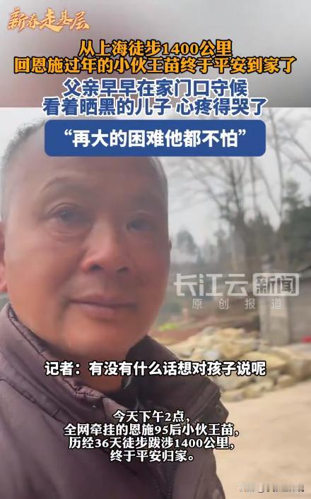 回家过年!这四个字在中国人心里有千斤之重,催生出的事情也感人至极。一位叫王苗的小伙用36天时间,从上海徒步1400公里回恩施过年,而他的父亲早已在门前等候多时……   1400公里是什么概念?每天要走几十公里,风餐露宿,一路上肯定要吃不少苦,如果看过中国优秀公路片《落叶归根》的朋友应该会有更深刻的感受,那艰辛的过程,想想就觉得不容易。   支撑王苗这位小伙子走下去的,就是心里那份对家的牵挂,对过年团圆的期盼,而这份期盼,同样来自王苗的家人,另一边,他的父亲早已在自家门前等候多时,日复一日,盼着儿子归来。   当看到风尘仆仆、满脸疲惫的儿子出现在眼前的那一刻,父亲瞬间就红了眼眶,所有的思念和牵挂,都藏在那泛红的眼眶里,藏在一句没说出口的“你可回来了”的话语里。   这就是中国人的过年情结,这就是刻在骨子里的亲情,不管走多远、走多久,家永远是我们的避风港,家人永远是我们的牵挂。   王苗的徒步回家,父亲的默默等候,看似是一件小事,却藏着最动人的深情,也道出了无数中国人的心声——过年,就是要回家,就是要和家人在一起,团团圆圆、踏踏实实地共度春节!   以上均是小编个人看法,如果您也认同,麻烦点赞支持!有更好的见解也欢迎在评论区留言,方便大家一同探讨。{抱拳}