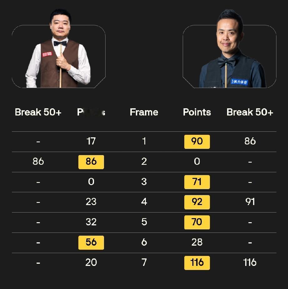丁俊晖无缘玉山世界公开赛正赛,接下来两个月,丁俊晖无球可打,直到世锦赛。 两个月期间,丁俊晖有可能排名跌出前16,那样的话,他将失去世锦赛种子选手席位,要打资格赛。 本场比赛,傅家俊打出一杆破百两杆50+,5-2轻松击败丁俊晖。 丁俊晖目前的实力下滑十分明显,已经失去了竞争力。 其他球员,刘文炜5-3击败乔·奥康纳、巩晨智2-5利索夫斯基。 吕昊天4-3高阳、庞俊旭3-3山姆·克雷吉、江俊4-4斯坦·穆迪、