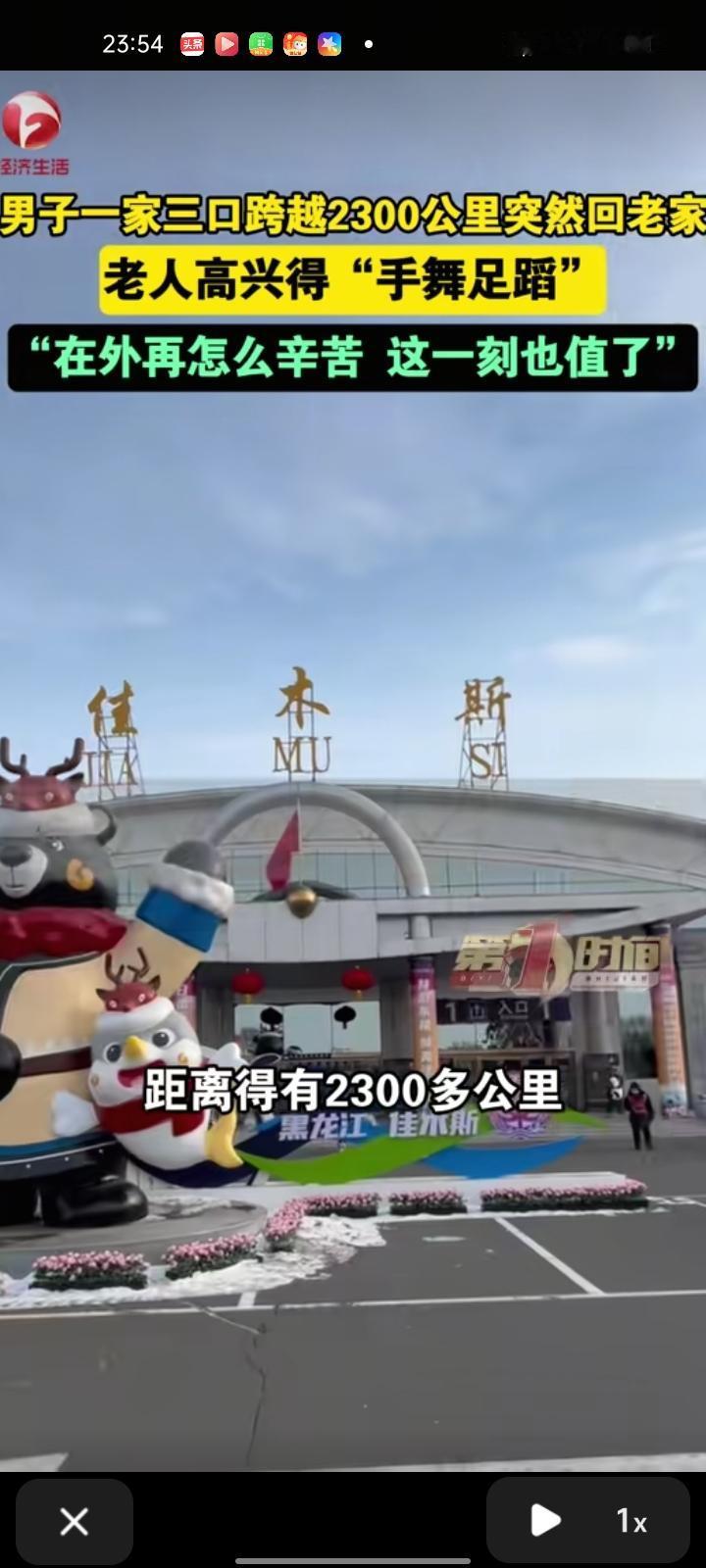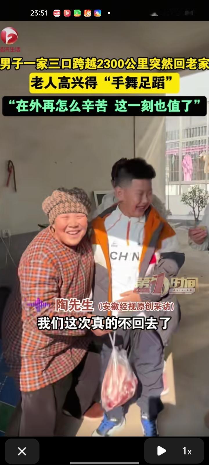 2月11日,江苏连云港。一家三口跨越2300公里突然回老家,老人高兴得手舞足蹈。陶先生称,他在黑龙江佳木斯工作,老家在江苏连云港,平常一年可能回去一次,有时工作忙回不去,老人原本以为他们真的回不去了,主要是想给老人一个惊喜,毕竟老人年纪大了,想回家陪陪老人。在外再怎么辛苦,这一切都值了。