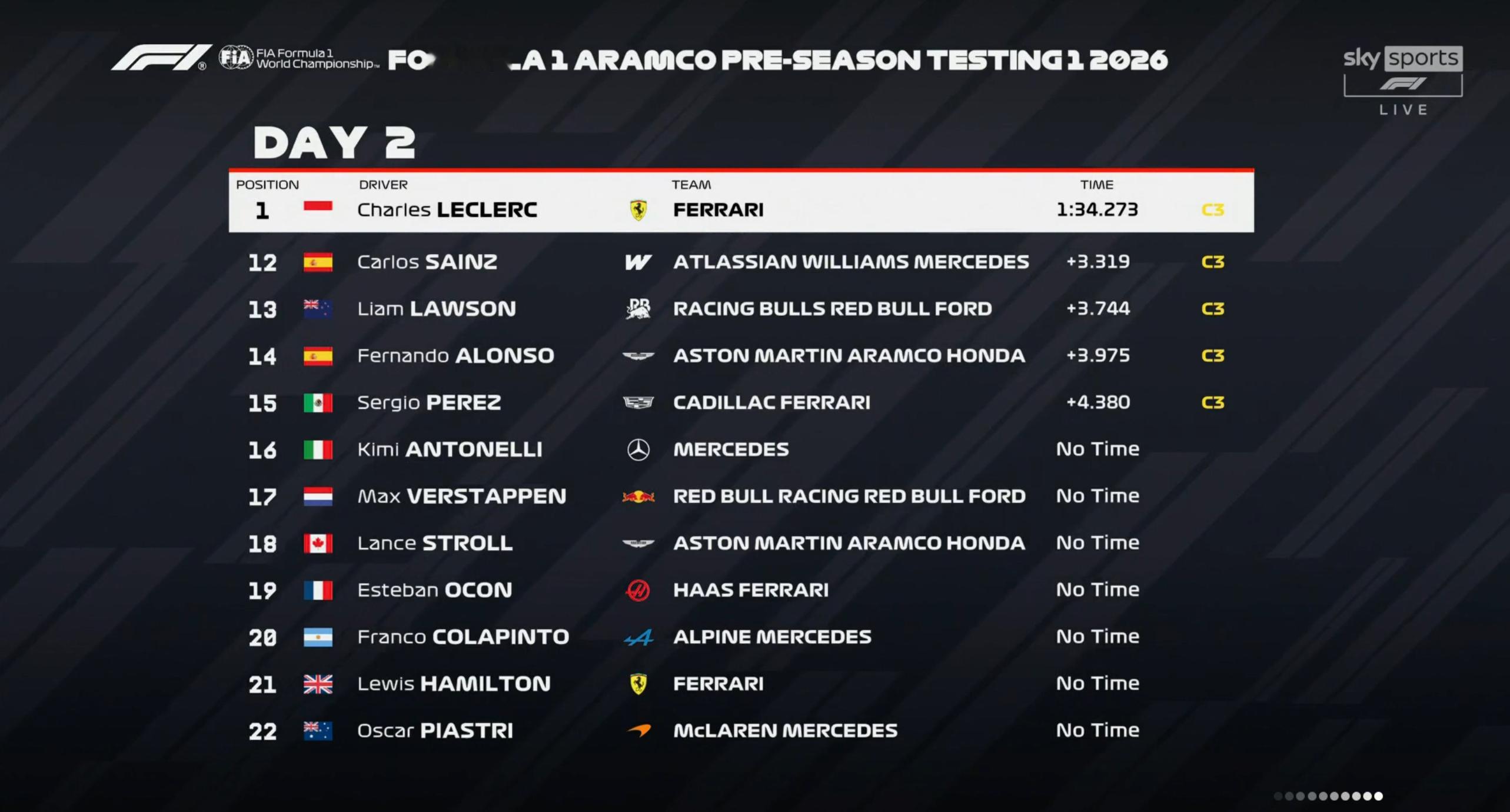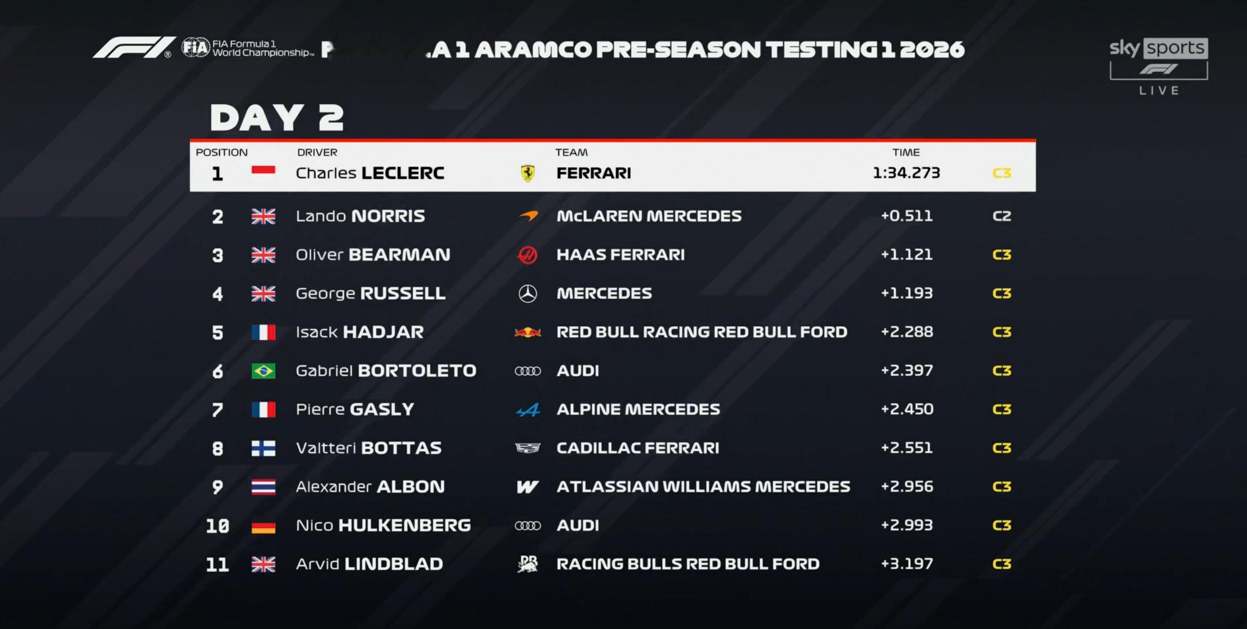 F1巴林冬测Day2:勒克莱尔最快,诺里斯P2,贝尔曼P3