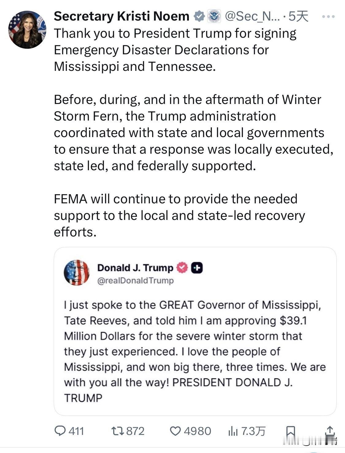 特朗普总统已于 2026年2月6日 正式批准了针对密西西比州和田纳西州的“重大灾难声明”(Major Disaster Declarations),以应对 1 月下旬席卷美国的灾难性冬季风暴。 此次行动是继 1 月 24 日签署初步“紧急状态声明”(Emergency Declarations)后的进一步升级,旨在通过联邦紧急事务管理署(FEMA)提供更多资金支持。 关键细节 适用灾害:2026年1月22日至27日期间发生的严重冬季风暴(包括低温、冻雨、大雪和冰暴)。 援助性质:批准了“公共援助”(Public Assistance),资金将用于支付应急防护措施、碎片清理以及受损公共设施的修复或更换。 资金安排: 田纳西州:特朗普批准了约 6060 万美元 的联邦援助。 密西西比州:覆盖了该州 82 个县及密西西比肖克陶印第安人部落。 预付资金:由于灾情严重,FEMA 此前已向密西西比、田纳西及路易斯安那三州累计预拨付了 1100 万美元 的应急响应资金,以便各州快速行动。 当前状态 地方反馈:密西西比州长泰特·里夫斯(Tate Reeves)和田纳西州长比尔·李(Bill Lee)均对特朗普政府的支持表示感谢,称这将显著加快灾后恢复工作。 后续观察:目前的声明主要针对公共和基础设施援助。关于针对个人或家庭(如房屋修缮或个人财产损失)的“个人援助”(Individual Assistance)仍在评估或审查中。