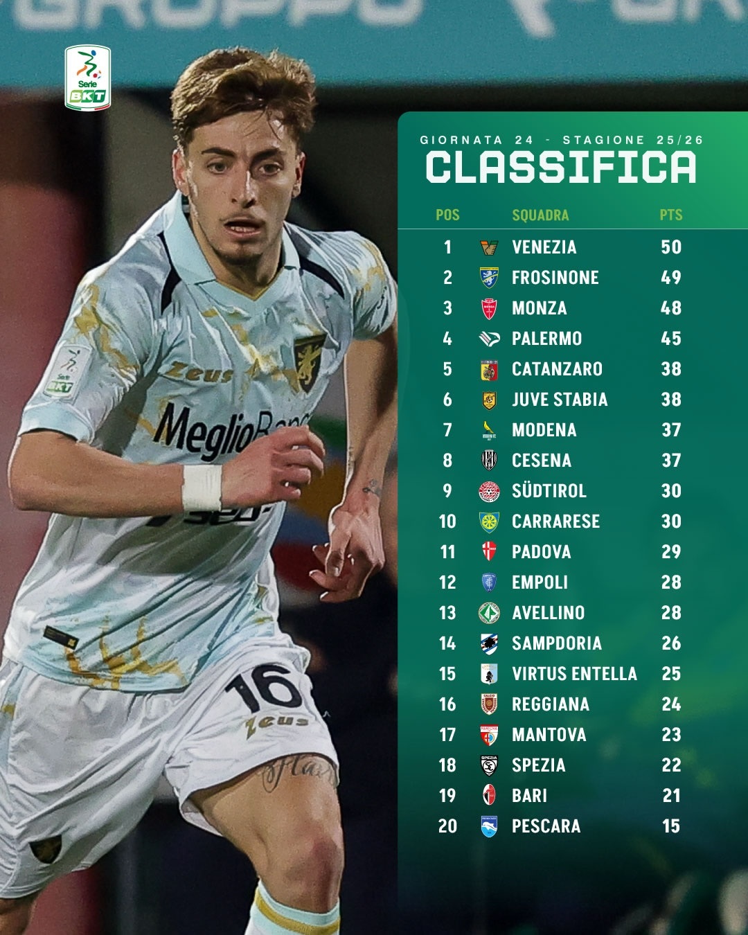 👉 由斯特罗帕🇮🇹教练执教的威尼斯队以15胜5平4负积50分,排名→第1位;