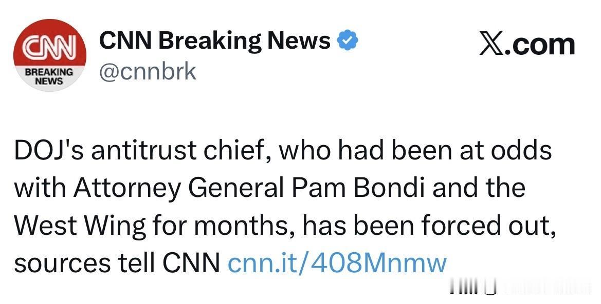 据 美国有线新闻网CNN 报道,美国司法部反垄断部门负责人因与司法部长帕姆·邦迪
