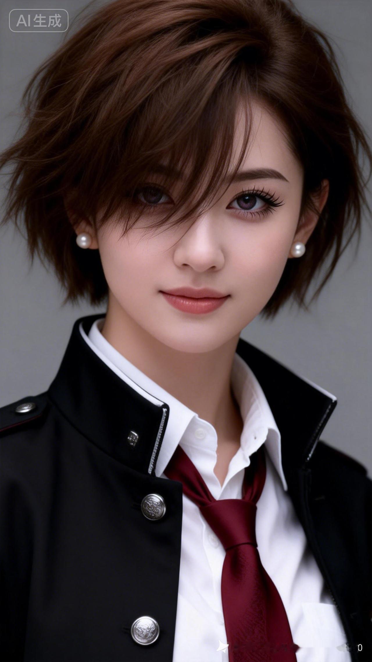 霸气女生棕短发蓬松微乱遮眼,暗调闪光瞳清冷深邃,黑立领校服配白衬衫与酒红领带,珍珠耳钉点缀,银暗磨砂氛围感怼脸特写,超高清写实。