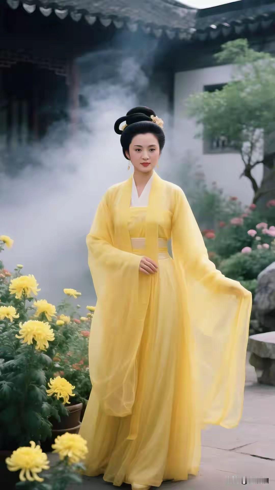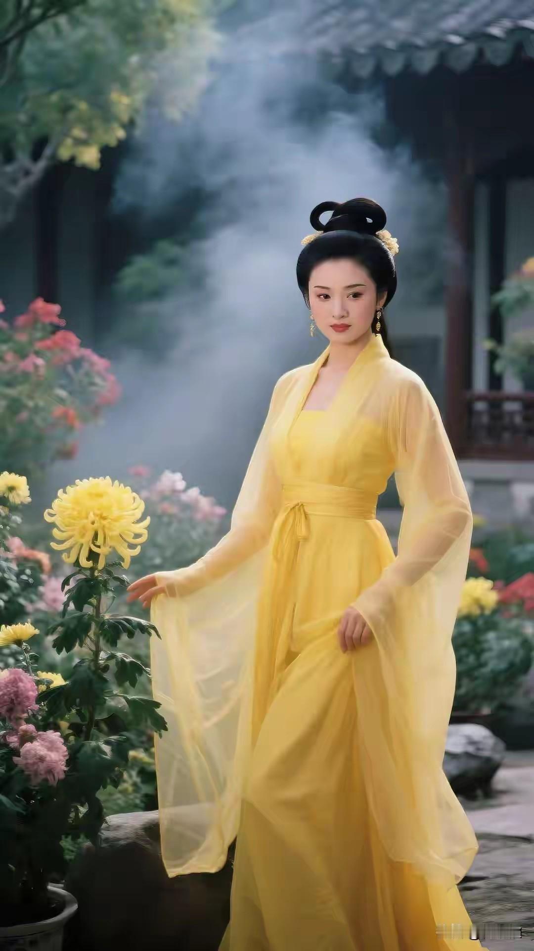 橘黄汉服雅韵生, 恰如仙女显风情。 云鬓轻挽花眼影, 容颜绝世韵倾城。