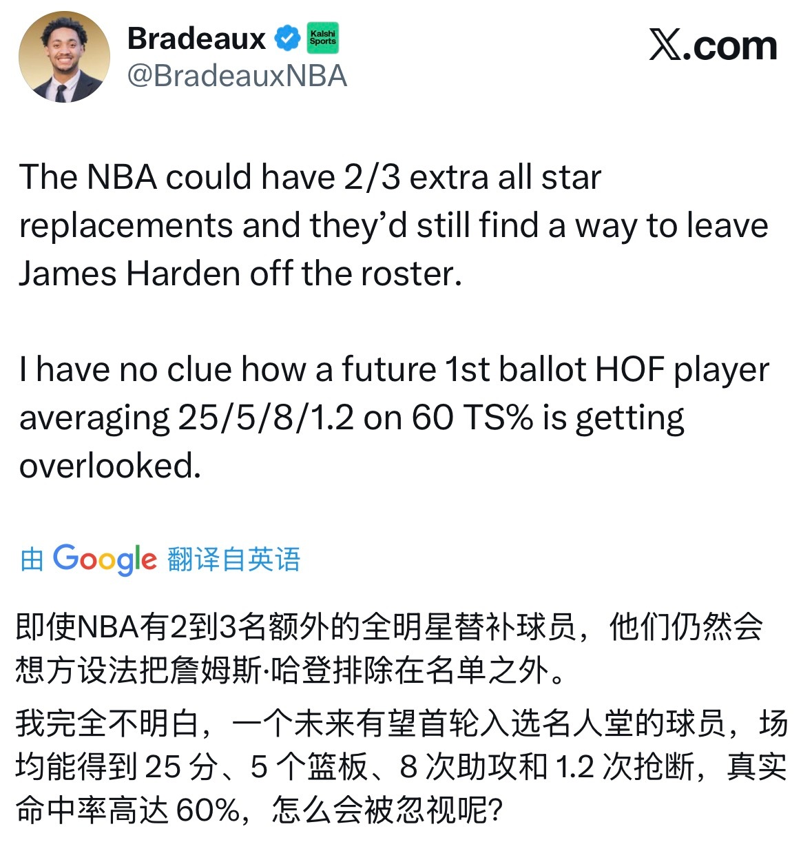 火箭自媒体:哪怕 NBA 全明星阵容能有 2 到 3 个额外的替补名额,他们最后肯定还是会有办法把哈登排除在名单之外。我真的搞不懂,一个未来注定入选名人堂的球员,场均能砍下 25 分、5 个篮板、8 次助攻,还有 1.2 次抢断,真实命中率(TS%)高达 60%,怎么就能被大家无视了呢?