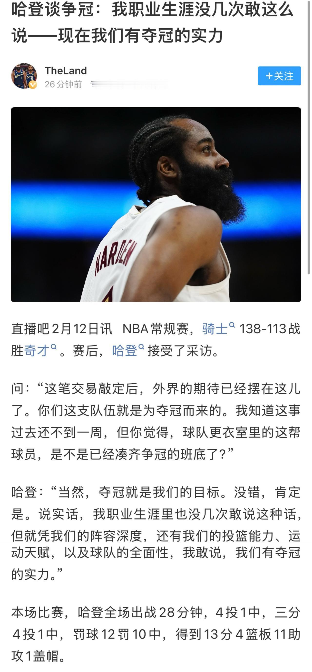 哈登说他职业生涯不敢说有夺冠实力,但这次骑士真有机会夺冠?? 哈登才来骑士几天,就看到夺冠几率了?? 目前骑士是东部第四,最多第二。 以前雷霆,火箭都有机会争冠,这次骑士让哈登重燃希望。[大金牙]