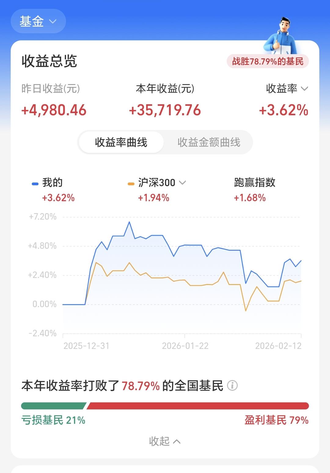 基金:今天的四个重要消息 昨天基金收益4980元,基金持有1023266元,现金持有924573元,现金收益24元,资产总额1947840,190万之上过节是稳了。 本周有了四个交易日,一亏三赢,一个交易日亏损,三个交易日盈利,周收益 21264元。 本月有了九个交易日,四赢五亏,四个交易日盈利,五个交易日亏损,月亏损8279元。 今年以来收益35719元,收益率3.62%,战胜了全国78.79%的基民,跑赢了沪深300指数1.94%的上涨幅度。 近一年以来收益449210元,收益率33.59%,跑赢了沪深300指数20.40%的上涨幅度。 持有的基金中,昨天晚上净值更新上涨幅度最大的三个板块是:AI应用板块,半导体板块,军工板块,下跌幅度最大的三个板块是:白酒板块,大消费板块,创新药板块。 欧洲市场昨天晚上涨跌不一,法国上涨了0.33%,德国下跌了0.01%,英国下跌了0.67%,涨跌幅度都不大。 美股市场昨天晚上下跌,道琼斯指数下跌了1.34%,标普指数下跌了1.57%,纳斯达克指数下跌了2.03%,下跌幅度都不小。 1:纳斯达克金龙中国指数初步收跌2.9%,富时A50期指连续夜盘收盘的时候下跌0.66%,收于14784点。 今天市场会低开,但低开的幅度不会很大, 低开稍微震荡以后,很快就会拉升,10点半之前就会拉至红盘,下午两点钟左右会有一个小的震荡,最后以红盘报收,三大指数全部上涨。 2:2026开年以来,新基金发行火热。1月新基金发行数量达169只,达到2023年3月以来的最高水平。多只基金一日售罄,还有产品因超募触发比例配售。 这些其实并不是一个好现象,凡是见到超百亿规模的基金一天之内完成资金募集,特别是多只基金在同一日内完成资金募集,甚至是由于募集的资金太多,需要通过配额决定份额,那都是市场见顶的信号之一,越是这个时候,我们的头脑越是要清醒,越是这个时候,我们越不能有新增资金进场,因为这很容易使你一年之内挣的钱,在一两个月以内就全部还回去。 3:今天中国人民银行将以固定数量、利率招标、多重价位中标方式开展10000亿元买断式逆回购操作,期限为6个月(182天)。 许多人把这个消息解读为重大利好消息,我认为这是一个利好消息,但不能称之为重大利好消息,它对市场的影响没有那么大,这个消息决定不了今天市场的走势,这个消息出来以后并没有引起多大的波澜,而昨天晚上欧美市场的普跌,对我们今天走势的影响会更大一些,这也是我为什么判断今天会低开的原因,这个逆回购动作出来以后,反而降低了近期降准降息的可能性,从我的角度来看,这其实是一个偏空的消息。 4:基金投顾组合普遍提升了A股及债券仓位,同步减配现金资产、美股及港股持仓;行业维度则增配有色金属、电子、通信,减配生物医药、汽车及银行,建议围绕“出海+科技”两条主线布局,亦有观点认为港股估值安全边际显现,布局窗口正在打开。 对我们玩基金的人来说,均衡配置才是最重要的,均衡配置能够增加你持有热门板块的可能性,均衡配置可以让你的资金在板块间轮动,热门板块涨多了,你可以选择落袋为安,落袋为安的资金可以逐步投入到低位冷门板块里面去等待,一波板块轮动之后,你原先的冷门板块有可能会成为热门板块,而原先的那些热门板块有可能会成为冷门板块,市场的板块之间本来就是这样冷热轮动的,根本没有什么千年的热门板块,也没有什么永远的热门板块,需要你进场的时候,它是热门板块,在想对你进行收割的时候,它是热门板块,在对你收割完成之后,它就成为了冷门板块。 虽然今天外围市场大跌,虽然今天我们的市场大概率低开,但我对今年春节之前最后的一个交易日还是信心满满,我认为市场会低开高走,今天三大指数都是红盘报收,今天会给我们发一个节前红包,你觉得今天三大指数会不会收阳?你觉得今天会不会给我们发一个大大的节前红包?我今天的红包目标值是1.2万元,你今天的红包目标值是多少?