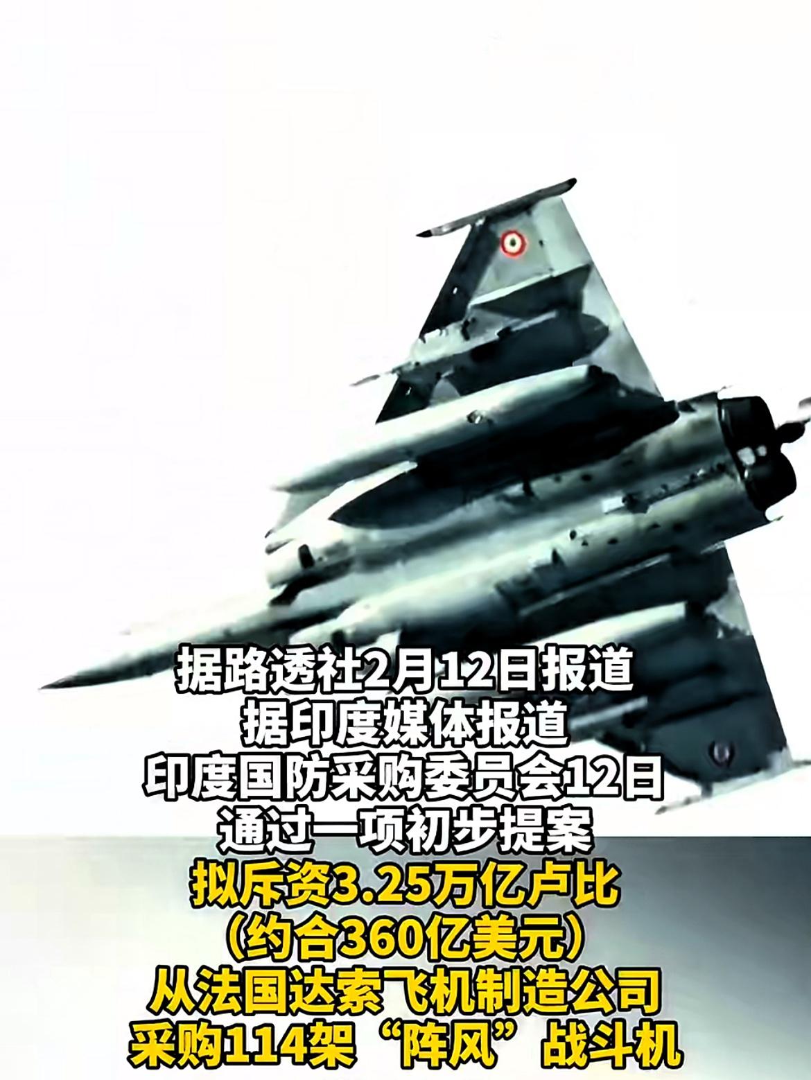 印度急了,猛砸3.6万亿要买战机! 2月12日,据《印度快报》报道,印度国防部高层官员透露,印度国防采办委员会(DAC)当天批准了一项提案,从法国采购114架“阵风”战斗机,其中90架将在印度本土生产。同时为印度海军从美国增购6架P-8I海上巡逻反潜战机。印度国防部发表声明称,国防采办委员会已对多项总额约3.6万亿卢比(约合2743.2 亿元人民币)的军购计划授予“必要性认可”(AoN)。 看来,印度这回是下了血本,不惜重金打造军事大国。但5.7空战已经表明“阵风”就是一阵风,是一个华而不实的铁疙瘩,徒有虚名而已。然而印度却还要大量的增购,谜一样的操作,不知道是图啥。这这一批准正值法国总统马克龙计划于2月17日至19日访问印度前夕。当然印法选这个日子一定也很有讲究,此时此刻正值中国传统年节的前三天正月初一到初三,在是中国的传统年节里。毋庸置疑,这明显里面有暗含针对中国的意思。就跟美日两国正式启动“铁拳”联合军演,持续时间到3月9日,总时长27天。这也是给中国添堵了! 由此可见,印度在军事扩张的道路上越走越远。而印度选在特定时间进行军购以及美日启动联合军演等行为,也凸显出其与部分西方国家在军事战略上的相互配合,试图对中国形成军事围堵与挑衅。但这种行为不过是自欺欺人的小把戏,中国有着强大的国防实力与坚定的捍卫国家主权的决心。 历史已多次证明,任何企图通过军事挑衅来遏制中国发展的行为都注定会失败。