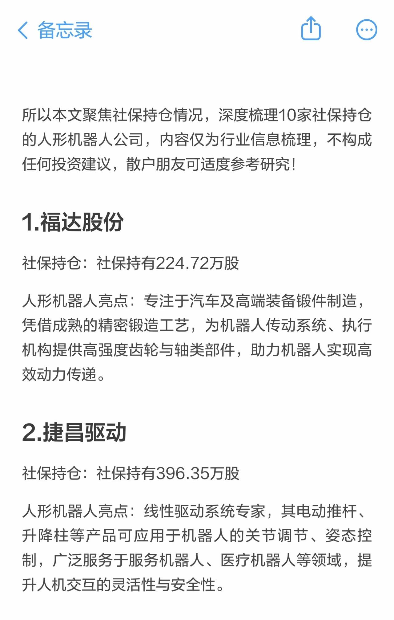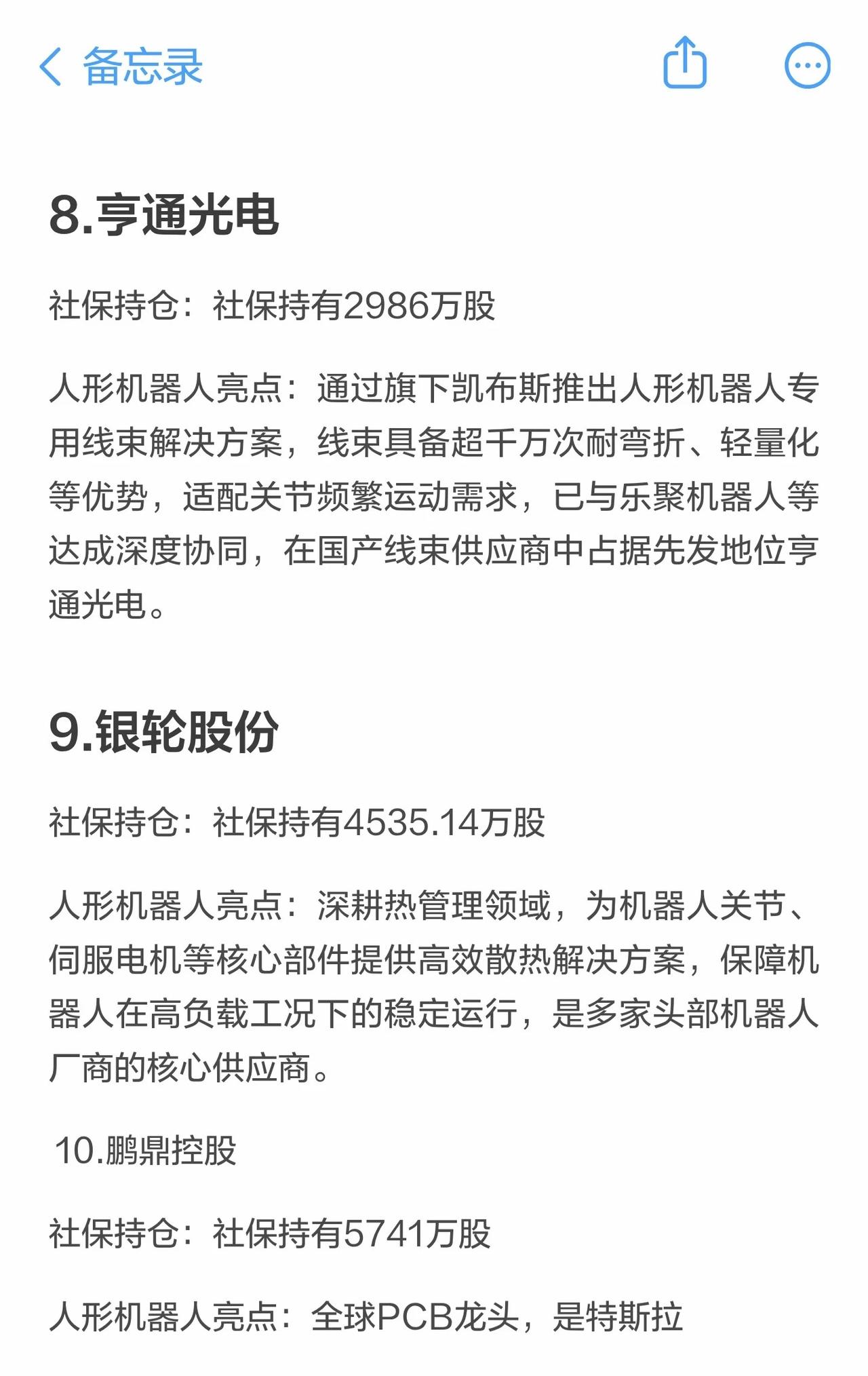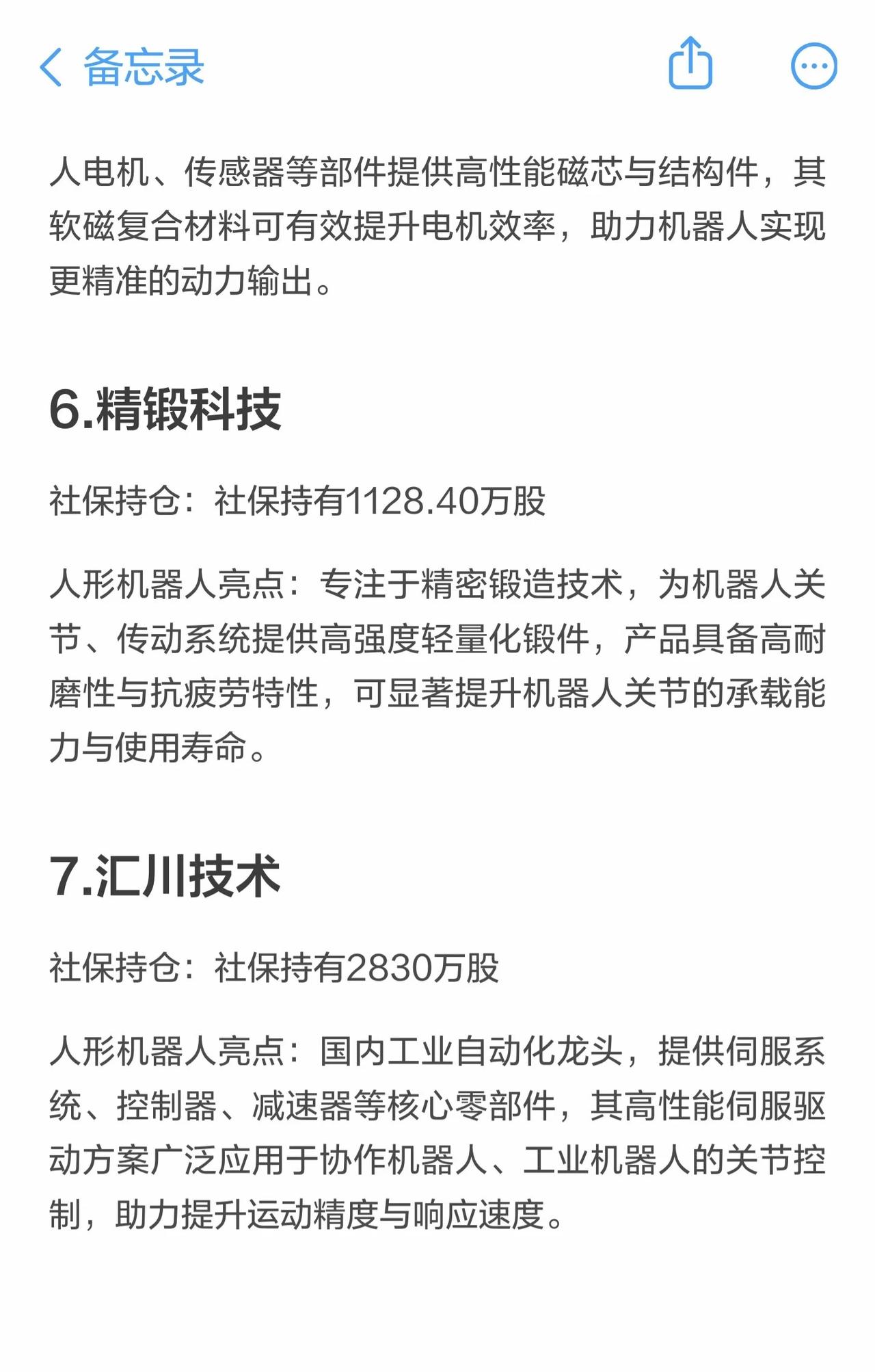 2026年人形机器人因政策、产业落地及春晚热度成科技赛道焦点,系量产商业化元年,建议关注社保持仓的10家相关公司,具体如下: 1. 福达股份(224.72万股):精密锻造工艺提供机器人传动/执行机构部件。 2. 捷昌驱动(396.35万股):线性驱动系统用于机器人关节调节等。 3. 香农芯创(778.24万股):提供机器人高精度减速器、线性模组等核心组件。 4. 新时达(817.47万股):工业机器人本体与系统集成核心企业,多场景规模化应用。 5. 东睦股份(819.76万股):粉末冶金/软磁材料龙头,提供机器人磁芯、结构件。 6. 精锻科技(1128.40万股):精密锻造技术提供机器人关节/传动系统锻件。 7. 汇川技术(2830万股):工业自动化龙头,提供伺服系统等核心零部件。 8. 亨通光电(2986万股):专用线束方案适配机器人关节运动,与乐聚等协同。 9. 银轮股份(4535.14万股):热管理方案保障机器人高负载运行,头部厂商核心供应商。 10. 鹏鼎控股(5741万股):全球PCB龙头,特斯拉供应商,为Optimus等提供核心PCB,订单排至2026年二季度。 注:内容仅行业信息梳理,不构成投资建议。