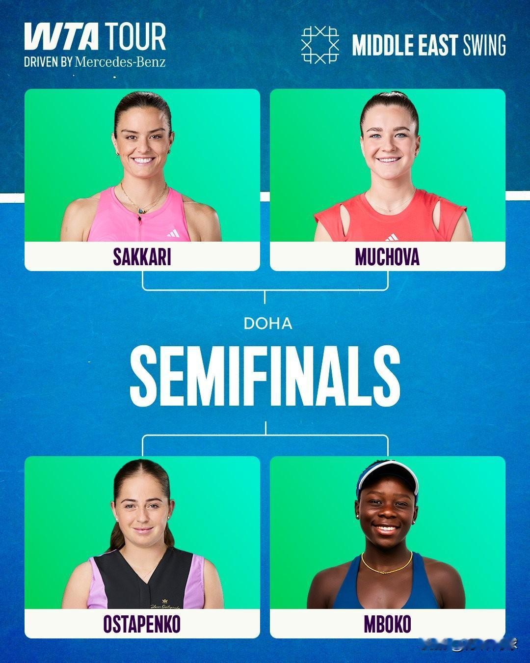 WTA1000多哈半决赛预告 23:00,🇱🇻奥斯塔彭科vs姆博科🇨🇦 遭遇战。 00:30,🇨🇿穆霍娃vs萨卡里🇬🇷 交手记录:穆霍娃4-1萨卡里 赔率看好决赛阵容: 穆霍娃vs姆博科 你以为呢? WTA精彩对决