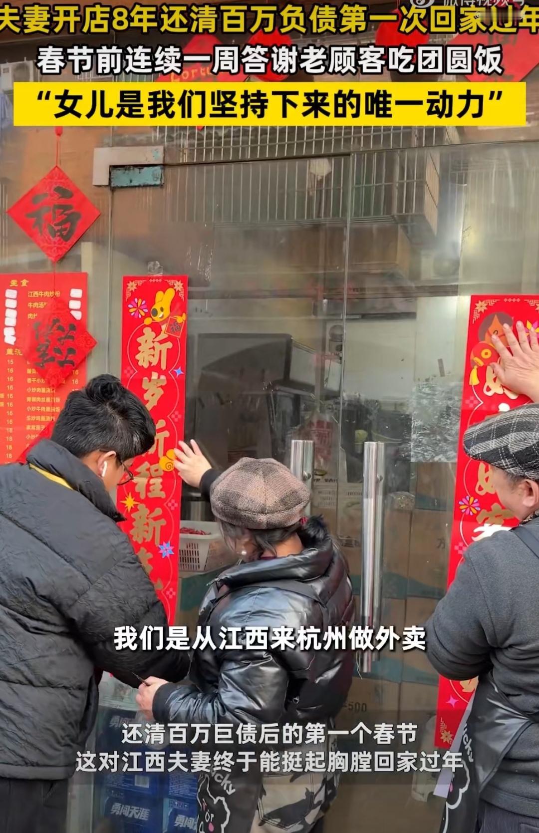 果然无债一身轻!浙江杭州,一对夫妻做生意失败后开了一家小店,从此以后每天都围在灶台前,连大年初一都不敢休息,只为还上百万的欠债,忙了8年两人做到了,终于能回老家过年了 杭州的一家小吃店里,深夜的灯光显得格外昏黄。并不宽敞的桌面上,那台磨得有些发亮的计算器终于归零了。 这对袁姓夫妻并没有欢呼,只是长长地舒了一口积压在胸口八年的浊气。哪怕窗外是寒冬腊月,这一刻的空气想必也是滚烫的。 一百万元。这不是银行流水里冰冷的数字,而是过去两千九百多个日夜里,压在这家人脊梁上的一座大山。 就在今年春节前夕,这张巨额账单终于变成了过去式。夫妻俩合上账本的那一刻,才是他们真正意义上的“过年”。 八年前,命运给这个家庭开了一个残酷的玩笑。生意场上的惨败,叠加女儿脑瘫需要长期治疗的重担,瞬间把这个江西家庭推入了百万负债的深渊。 那时候摆在他们面前的或许有无数条逃避的路,毕竟“老赖”在这个时代并不罕见。但这对夫妻选了最笨、最苦、也是最硬的一条路:背井离乡,去杭州,用一碗碗小吃把尊严赎回来。 你很难想象这种“赎身”的日子是怎么过的。这不是生活,这是一场针对时间的极限掠夺。 在这个讲究“躺平”的年代,他们把自己活成了不知疲倦的齿轮。每日凌晨四点,整座杭州城尚在酣眠之中,万籁俱寂。而他们店铺的卷帘门已悄然拉起,打破夜的静谧,开启新一天的营生。直到深夜街头无人,灶台的火才熄灭。 普通人眼里的日历有红色的节假日,但在他们的世界里,日历只有黑色的工作日。一年365天,他们能在店里守上360天。 甚至连往年的大年初一,那个本该走亲访友、哪怕是睡个懒觉的日子,他们也不敢停。因为每一天的停摆,都意味着那个天文数字的债务会晚一天清零。 这不仅仅是体力的透支,更是对意志力的漫长凌迟。周遭商铺的老板更迭不断,如流水般来来去去。然而,唯有他们这家店的灯,似一枚坚韧的钉子,稳稳地扎根在街角,于时光流转中坚守着。 支撑他们熬过这漫长八年的,除了还债的执念,还有一个更为沉重的“物理支点”。 23岁的女儿,因为脑瘫无法独立行走。在这漫长的岁月里,父亲袁先生的双臂,就是女儿的双腿。 从女儿还是个孩童,到如今长成大姑娘,这位父亲充当了整整23年的“人肉拐杖”。每日收工,即便身体疲惫不堪,他也始终如一地将女儿轻拥入怀,带着她一步一步地练习走路,风雨无阻,从未间断。 那是怎样一种重量?不仅是身体的负重,更是心理的负重。但他那双胳膊,从未缺席过哪怕一天。 好在,这个世界终究是守恒的。当你咬牙死磕的时候,光真的会照进来。 就在债务即将清零的关口,一家爱心企业送来了助行器。当女儿第一次脱离父亲的怀抱,靠着器械颤颤巍巍却独立站立的那一刻,全家人的眼眶都红了。 这不仅是肢体的站立,更是这个家庭人格的“站立”。 债还完了,人自由了。夫妻俩做的第一件事,却不是急着享受,而是摆了几桌热气腾腾的“团圆饭”。 他们请来了这些年光顾生意的老顾客,全部免费。这顿饭吃的是情义。他们心里门儿清:这一百万的坑,是靠自己一勺一勺填平的,但也离不开这些食客日复一日的帮衬。 这才是最让人动容的地方。在泥潭里挣扎了八年,他们没有变得冷漠乖戾,反而把心捂得更热了。 今年春节,这辆回江西老家的车,载重应该比往年轻得多。 以前过年回老家,那是“身在曹营心在汉”,每一秒的欢聚背后都藏着算计和焦虑。而这一次,是一场彻底的“清零重启”。 车窗外的风景没变,但看风景的人心境变了。对于袁家来说,风雨已经停了。 这种在绝境中不逃避、不认怂,硬是用双手把烂牌打出结局的故事,比任何宏大的叙事都更具力量。 所谓的“无债一身轻”,不是因为钱没了,而是因为脊梁骨终于可以毫无负担地挺直了。祝福这一家人,往后的日子,只剩坦途。