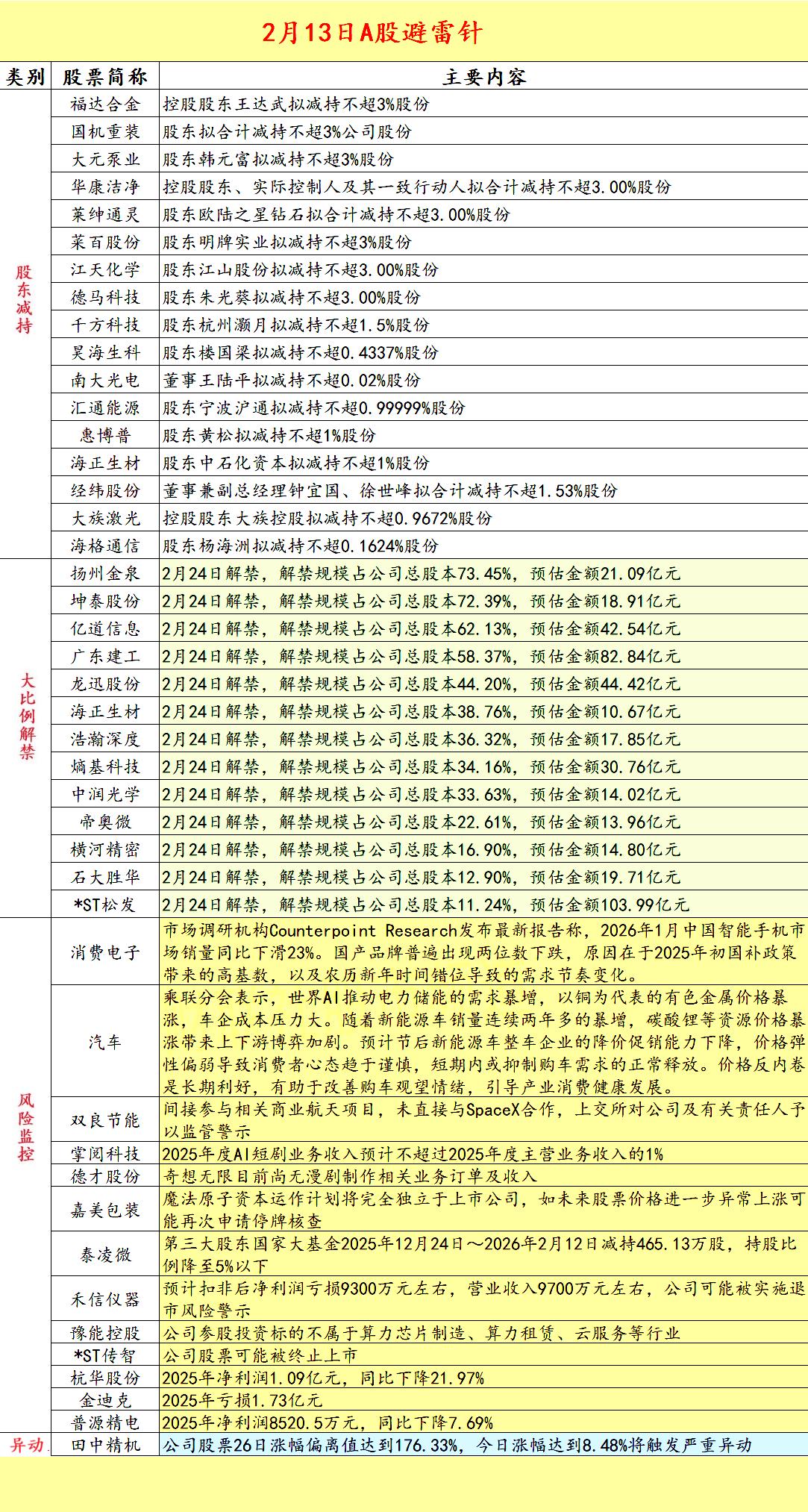 2026.2.13 A股拟减持,解禁,异动,风险警示