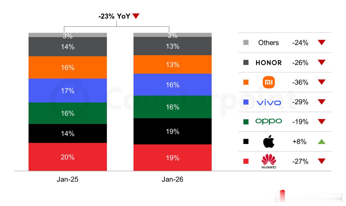 iPhone 17系列已完成2000万销量里程碑,而另一份来自Counterpoint的数据显示:今年第一个月的智能手机销量,除了苹果其余全部都是负增。