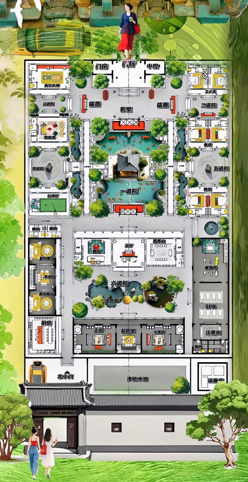 你知道吗?4800㎡自建房,不是房子多,而是院子香,唤醒合院,激活六进院的布局,真正实现大院套小院的格局,尤其是给两个保姆房,16㎡雅小院! 感觉独立小院,才是自建房的家常便饭! 合院最让人喜欢的,小门入主卧,搭配的六进院,大门见影壁,搭档是一进院! 前门看到是端景,藏着客房和工人房,后门看到的是厨房,藏着的是健身房,一个烟火气,另一个管生活品质! 这个是从动线上看出来! 其实它两种布局模式,独立和格局! 布局上100%的独立状态,动线上90%洄游,相当于,六个院子和十五个平台,打造的园林式自建房! 六进院有一个念头,格局上各管一摊,动线上曲径通幽! 暖廊做过道,真正的彻底的解决隐私! 院子有智慧,为每个空间,创造出最治愈的情境。 如果你已经长大,它就是渡假村! 如果你是娃儿,它是最原始的的天然游乐园! 脾气在大,它让你心静了,集齐布置岛、瀑布、土山、溪流、桥、亭、榭等,如果你动手能力强的大妈,完全做到四季开花的合院! 我自己深有体会,跟大年吃饺子掉了醋碟似的,攒劲儿! 自建房还想焕然一新,增一厨,去一厅! 说实在,如果不强制,布局还有不完美,前院配灶台,后院藏小厨更合适,业主喜欢,也无法妨!