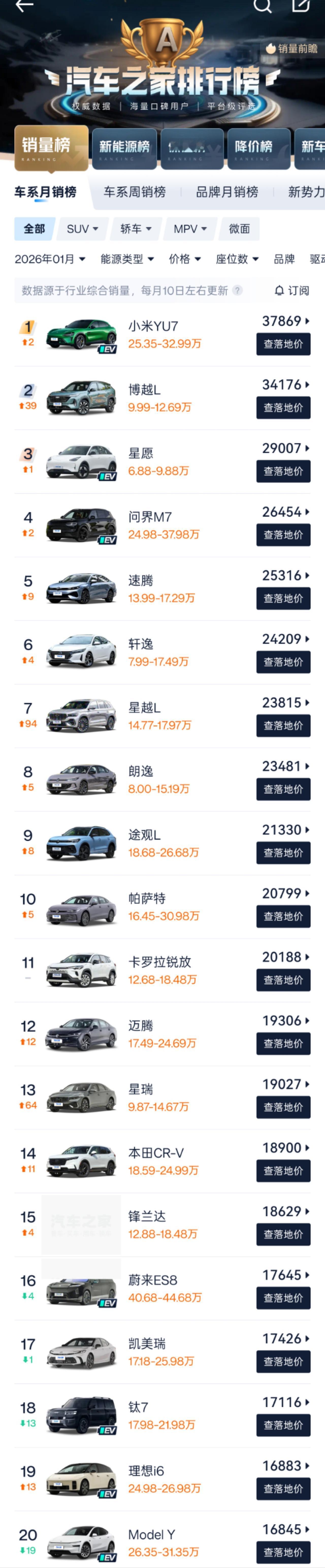 2026年真的是电车寒冬吗?[震惊]1月份销量排名出来了,不加任何限制定语,销量前20名你们猜猜有几台电车? 数了一下,销量前10名,就3台是电车?YU7第一,星愿第三,M7第四,剩下的就全是油车了。即便是看到销量前20名,也就7台是电车,而且这里面ModelY成了垫底(特斯拉受出口月影响,但是别的品牌总不至于吧?) 而且看排名趋势,这里面电车销量基本都在下跌,而很多油车销量排名是上涨的。。这说明什么问题?说明在2026年开始收一半购置税后,很多人反而转头去买油车了[笑哭]难道2026年电车真的不香了?你们觉得呢?