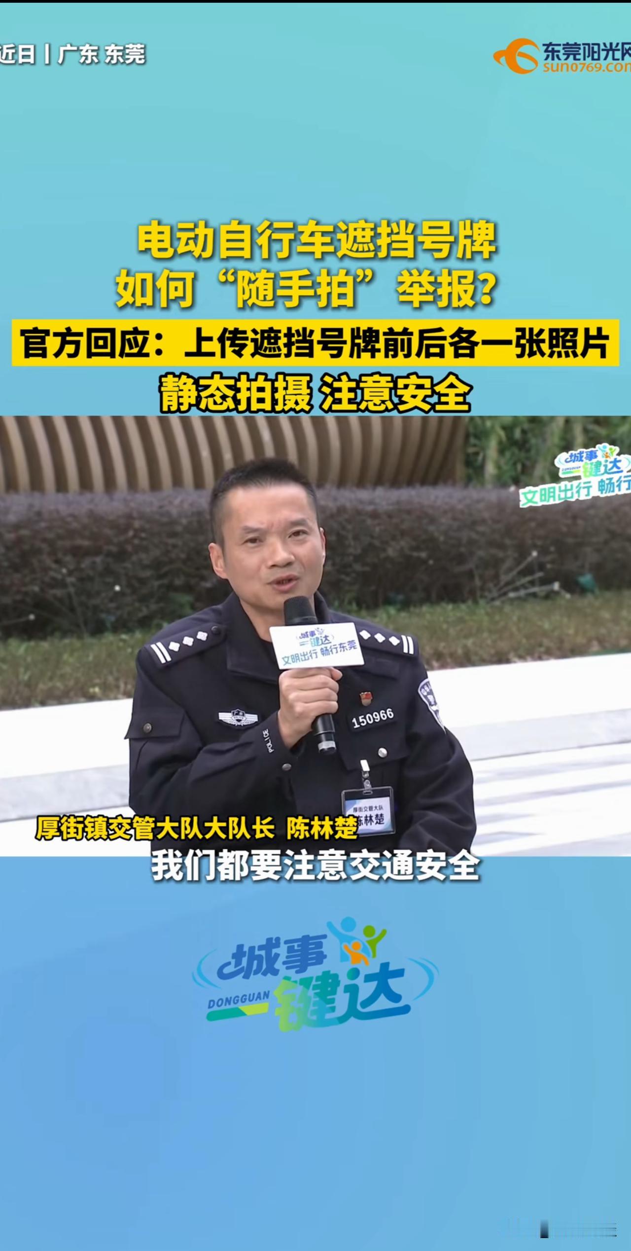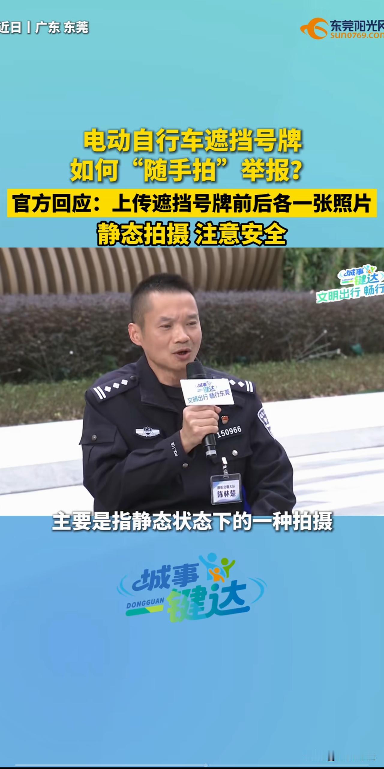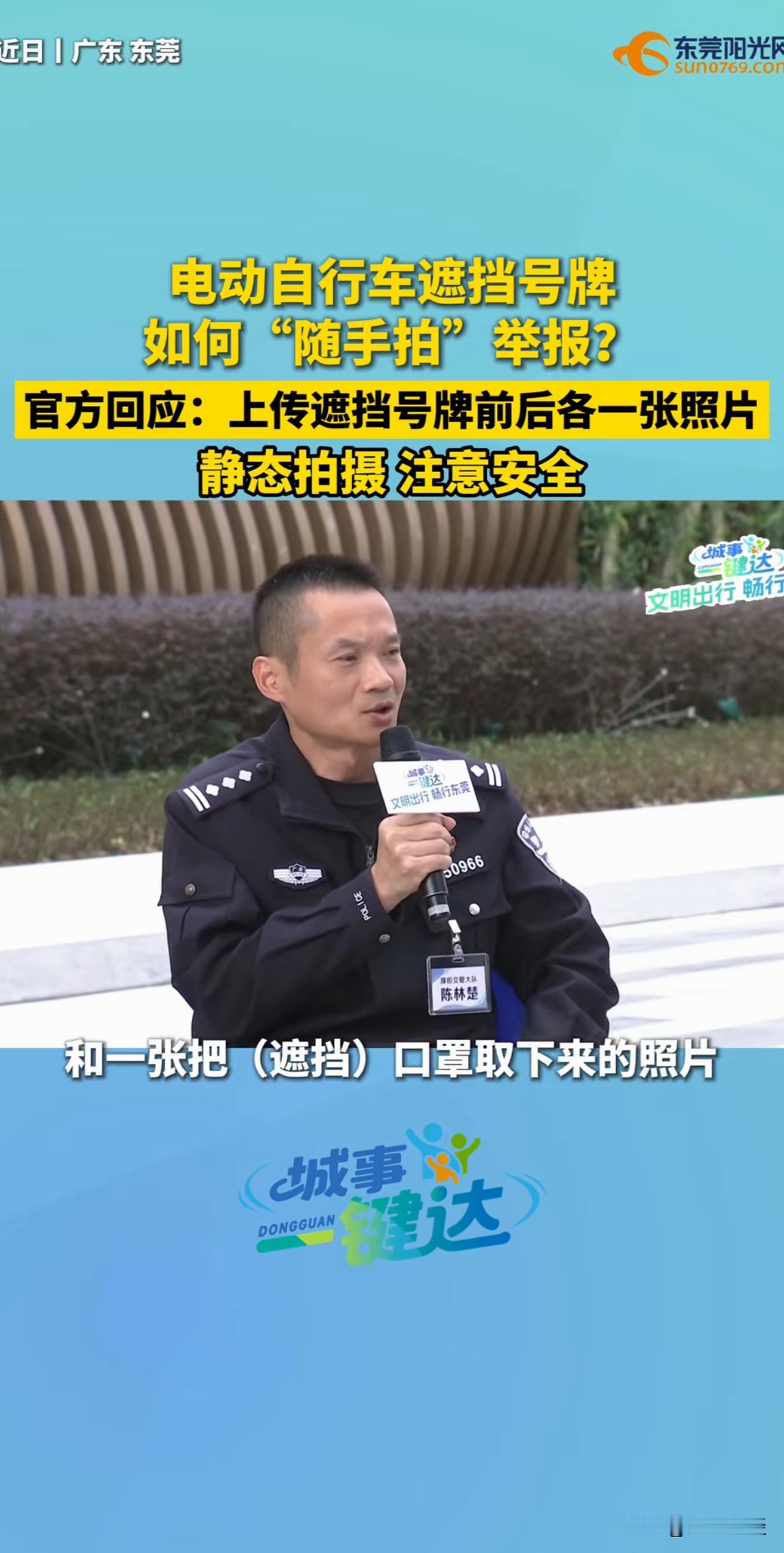 广东开先河!全省全国推广!电动车遮挡号牌可以举报了!就问电鸡怕不怕?广东一城市电动自行车遮挡号牌可以通过“随手拍”进行举报了,只需要拍摄两张照片即可,一张是遮挡号牌的照片,一张是把遮挡物例如口罩取下来后露出车牌号码的照片! 发挥广大群众的监督作用,让电鸡遮挡号牌无处可逃! 当然了,随手拍不仅仅可以举报电鸡遮挡号牌,摩托车,小汽车遮挡号牌也可以举报。 也就是说去掉遮挡号牌的口罩、贴纸、纸板、毛巾等不属于损坏他人财物。可以放心大胆的撤掉遮挡物,制止违法行为,这是公民的合法权利! 希望全省全国推广,技术上是没有任何问题的。通过市民监督,可以有效解决遮挡号牌的问题,哪怕没有奖励。也还是有很多热心市民积极参与的。