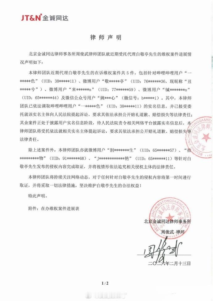 白敬亭律师声明,发布全平台告黑维权名单!网络并非法外之地,支持白敬亭依法维权💪