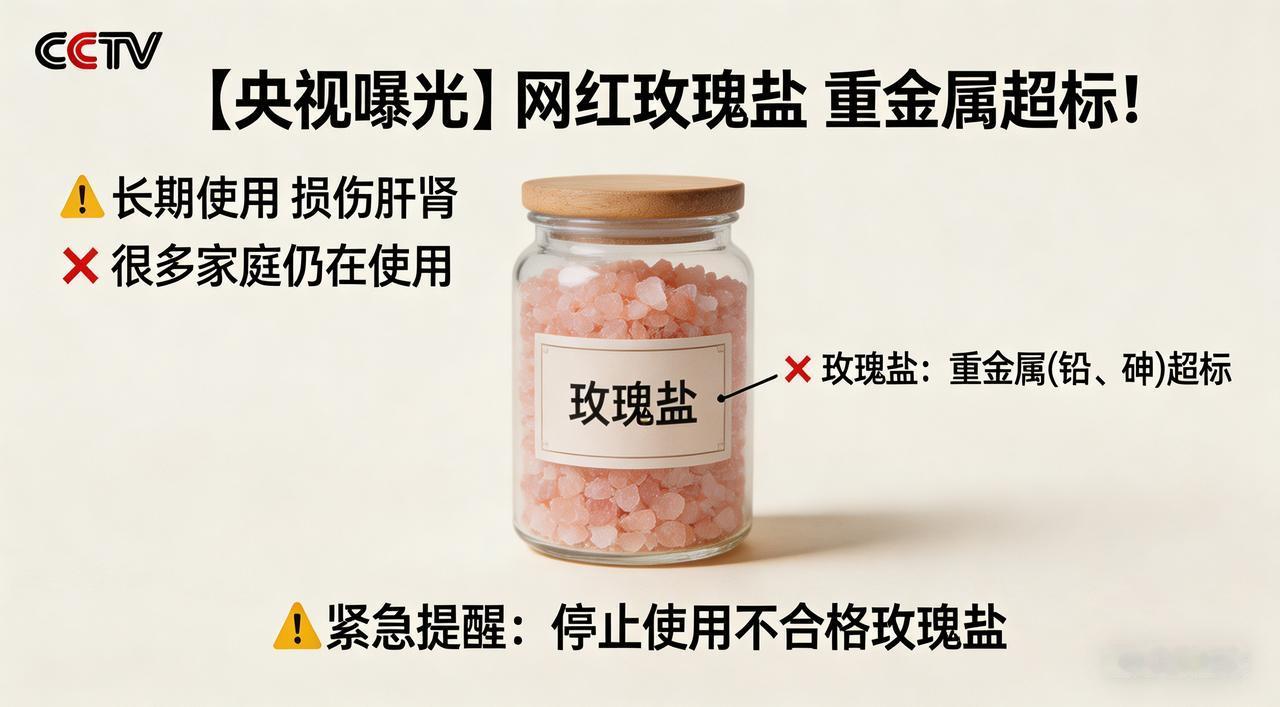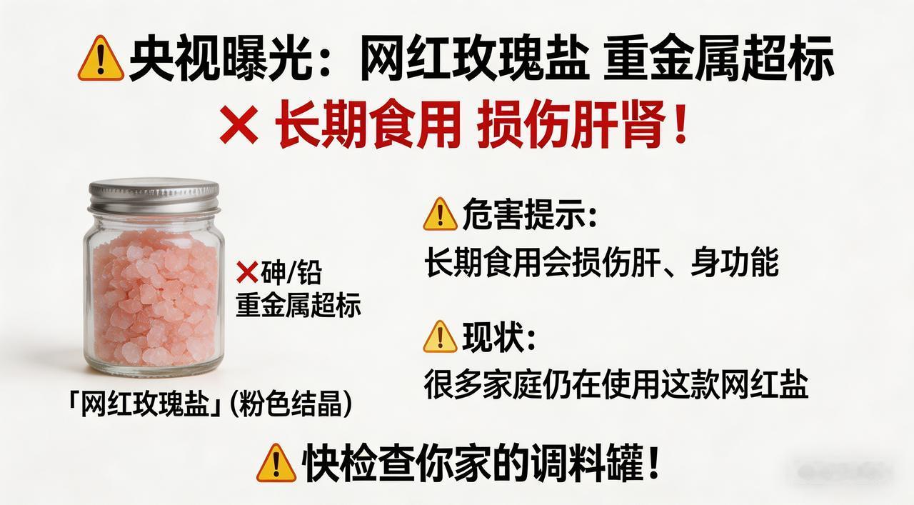 央视曝光网红玫瑰盐:重金属超标伤肝肾,很多家庭还在用 惊爆!央视紧急曝光:这款“网红盐”竟是肝肾“隐形杀手”,无数家庭已中招! 近日,央视一档权威调查节目如同一记重锤,狠狠砸向了当下火热的网红市场——曾被无数消费者追捧、标榜“健康高端”的“玫瑰盐”,竟被揭露是隐藏在厨房中的“健康炸弹”,长期食用将对肝肾造成不可逆的严重伤害,消息一出,瞬间引发社会广泛关注与恐慌! 梦幻外衣下的美丽陷阱 玫瑰盐,以其如梦幻般浪漫的粉红色外观,甫一登场便迅速俘获了众多消费者的心。商家们更是绞尽脑汁,精心炮制出一系列诱人的宣传话术。他们宣称,这粉色的盐粒产自神秘而遥远的喜马拉雅山脉,是历经2.8亿年漫长岁月形成的天然岩盐,富含多达84种微量元素,堪称“盐中贵族”。还大肆鼓吹其“0添加纯天然”“低钠更健康”,仿佛只要用上这玫瑰盐,就能开启健康生活的新篇章[2][4]。 在热闹喧嚣的直播间里,主播们更是使出浑身解数,唾沫横飞地推销着。他们拍着胸脯保证,用玫瑰盐做宝宝辅食,能让宝宝聪明伶俐、健康成长;煎牛排时撒上一点,瞬间增添独特风味,让牛排变得高大上;拌沙拉时加入,更是尽显高端时尚。在主播们的轮番“洗脑”下,许多家长被冲昏了头脑,不惜花高价大量购买,满心欢喜地以为是在为家人的健康保驾护航,却不知自己正一步步踏入商家精心设计的陷阱[3]。 真相揭露:美丽背后的致命毒药 然而,当央视调查组深入调查后,玫瑰盐那美丽的外衣被无情地撕下,露出了其丑恶的真面目。原来,玫瑰盐根本未通过我国食用盐强制性国家标准检验。它那迷人的粉红色,并非什么神奇的微量元素所致,而是氧化铁在“捣鬼”,简单来说,就是盐里混了铁锈。而我国食用盐有着严格的标准,必须是纯净的白色[5]。 从成分上看,普通精制盐氯化钠纯度高达99%以上,是人体所需钠元素的重要来源。可玫瑰盐呢,氯化钠纯度却只有95%左右,剩下的5%全是泥沙、石英和不明矿物质残留,这些杂质不仅没有任何营养价值,还可能对人体造成危害[5]。更可怕的是,部分批次的玫瑰盐还检出了铅、砷、铬等有毒重金属。长期摄入这些重金属,它们会在肝肾中不断蓄积,就像一颗颗定时炸弹,逐渐加重肝肾负担,导致肝细胞受损,出现ALT、AST等肝功能指标异常升高的情况,严重时甚至会引发肝肾衰竭,危及生命[1][2]。 受害者现身说法:悔恨交加的惨痛教训 有一位宝妈,在直播间听信了主播的推荐,购买了玫瑰盐后,便天天用它给孩子做辅食,家里的炒菜、汤粥也都换成了玫瑰盐。她满心以为,这样能让家人吃得健康又美味。然而,当看到央视曝光后,她如梦初醒,慌慌张张地带孩子去医院检查。结果出来后,她差点晕过去——孩子的肝功能指标全线异常。看着孩子痛苦的模样,她后悔得直掉眼泪,恨自己当初为什么那么轻易就相信了商家的宣传[3]。 专家呼吁:理性消费,守护健康 针对这一事件,营养学专家郑重提醒广大消费者,选盐一定要认准国标加碘精制盐,切勿被网红产品的华丽包装和虚假宣传所迷惑。在购买食品时,要保持理性,不要盲目跟风,多了解产品的相关信息和标准,避免陷入消费陷阱。健康无小事,别让一时的“健康幻想”毁了家人的幸福。 目前,相关部门已介入调查,将对玫瑰盐的生产、销售环节进行全面整治,严厉打击商家的违法行为,维护消费者的合法权益。让我们共同期待,市场能早日恢复健康有序,让消费者能够放心消费。