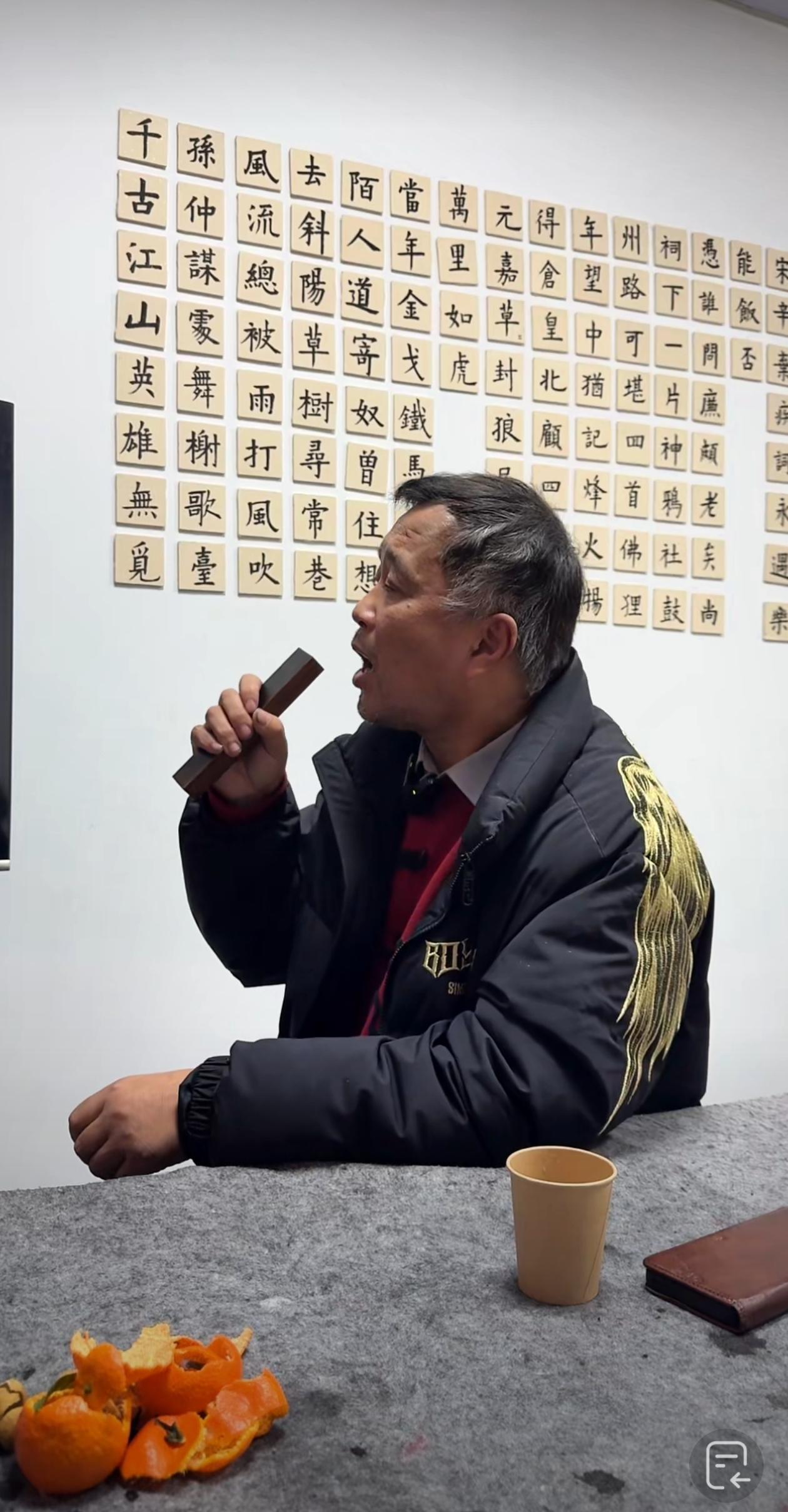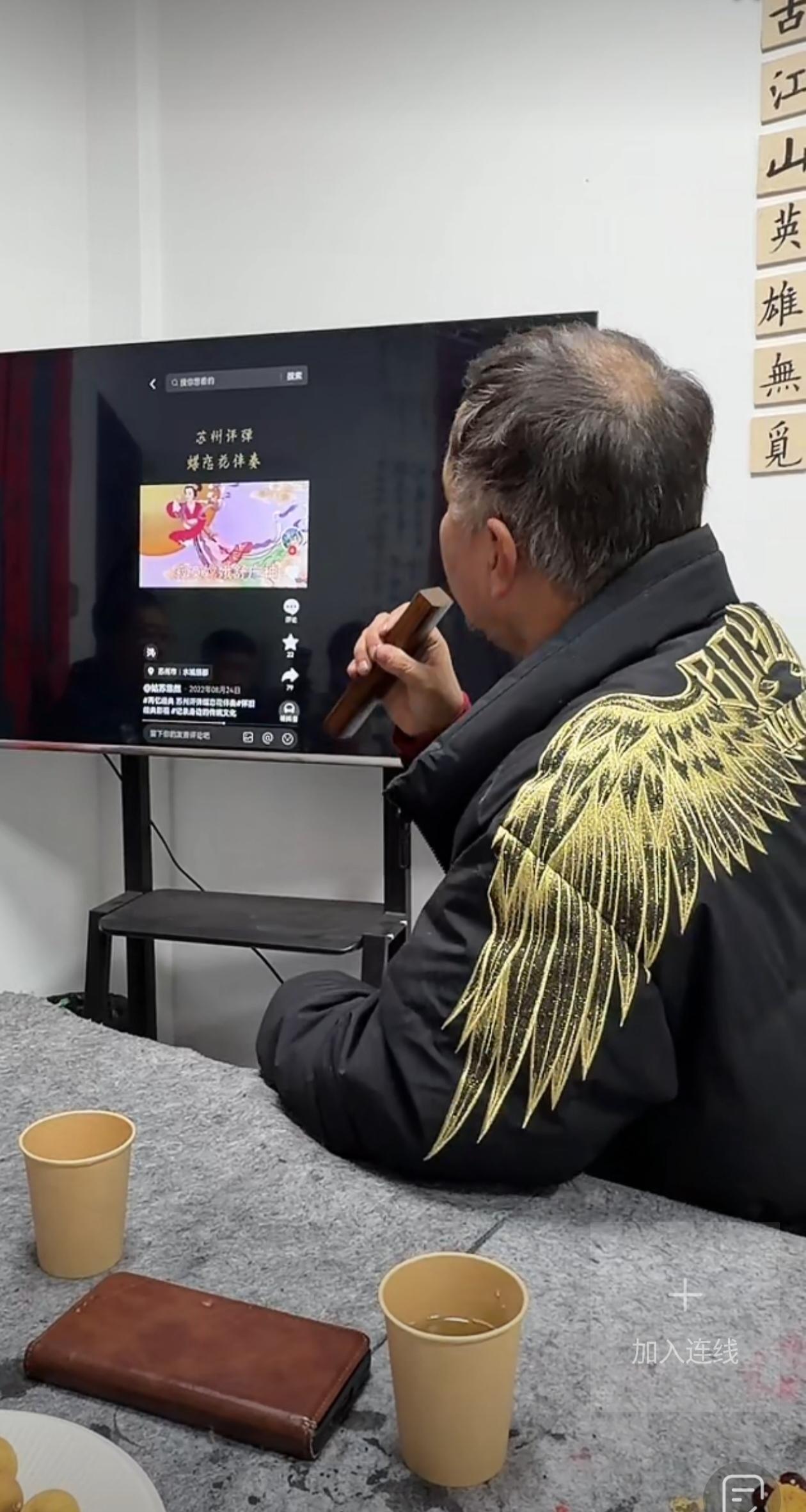 沈巍老师唱了半天的“独角戏”,唱苏州评弹太投入了,拿着木制的“话筒”,对着电视屏幕,唱得有模有样。但说句实话,还是没有他唱沪剧《为你打开一扇窗》那么好听,可能是他前段时间到黄养辉艺术馆听了评弹受到了启发,他要好好练习,发扬传统文化。