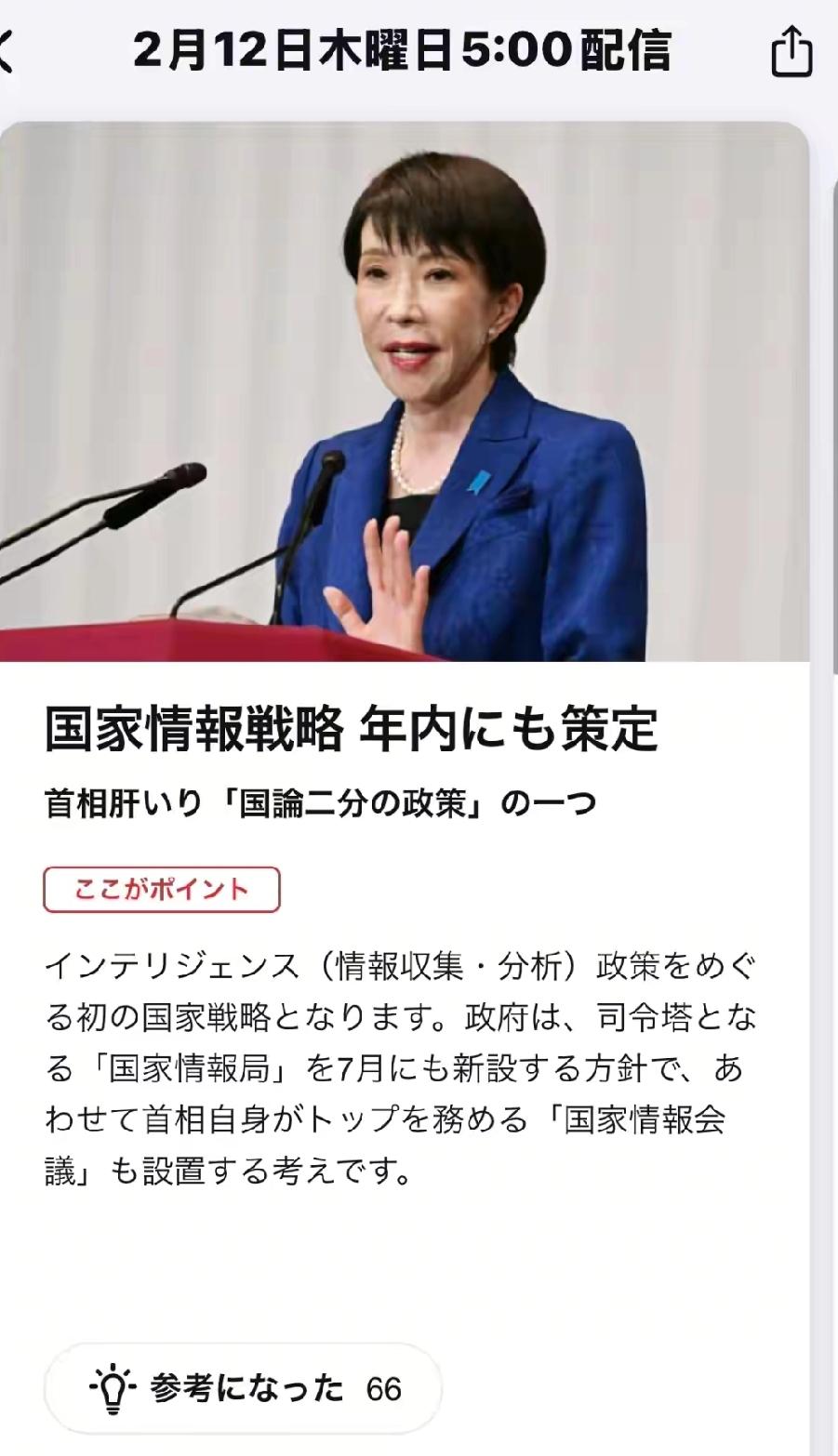 日本版CIA成立 2月12日,高市早苗宣布将会在今年7月设立国家情报局,将内阁情报调查室,外务省国际情报局,防卫省情报本部,法务省公安调查厅,警察厅国际犯罪调查局,五个职能合并一起,打造一个直接服务首相的“日本版中央情报局” 个人认为:这是嫌弃日本情报力量分散,无法形成合力的举措。也是变相增强高市早苗掌控日本国内外的举措之一。 原有的力量被打散,不一定就会形成合力,反而有可能越来越散。 有这样的一个能挑事,能伪装,能演戏,无才又无德的自私自利者在日本。 准备妥当,提防头脑发热,自不量力的日本人发动偷袭。