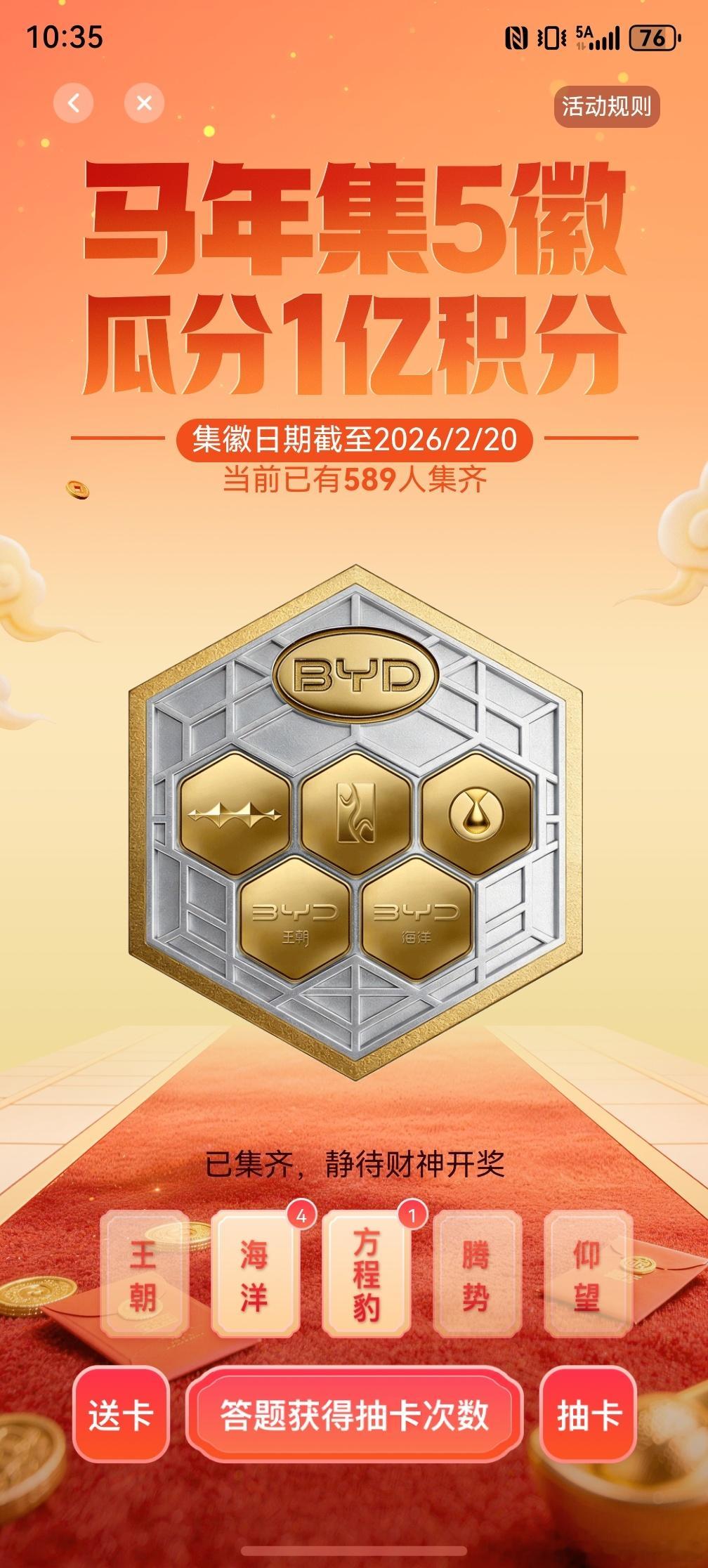 比亚迪集五徽分1亿积分 挺简单的啊,点进去抽了几次就集齐了