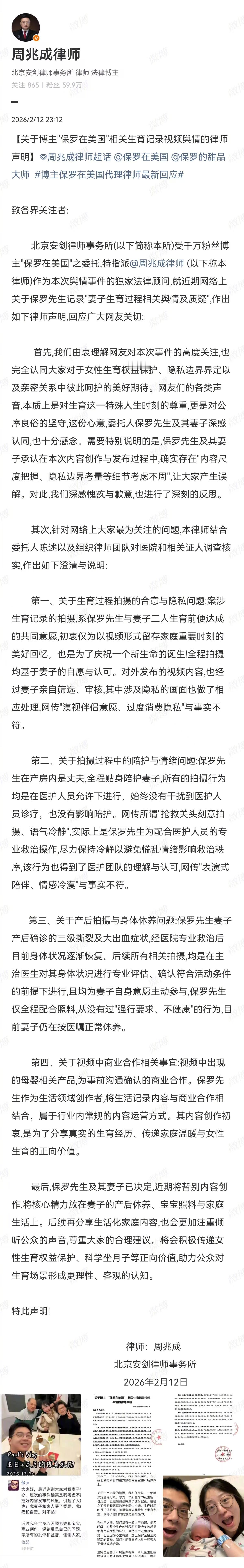 保罗在美国方律师声明【千万粉丝网红晒妻子生产过程引众怒,博主“保罗在美国”委托律师回应:承认生育记录视频内容尺度考虑不周并致歉】博主保罗在美国道歉 保罗在美国否认强迫妻子参与 2月12日,周兆成律师发布关于博主"保罗在美国"相关生育记录视频舆情的律师声明。就生育记录视频舆情集中回应:承认内容尺度考虑不周并致歉;澄清与说明拍摄系夫妻共同意愿、经妻子亲自审核,网传“漠视伴侣意愿”“表演式陪伴”不实;产后拍摄均在医生评估、妻子主动参与下进行。保罗夫妇决定暂别创作,专注妻子产后休养及宝宝照料。保罗夫妇决定暂别创作