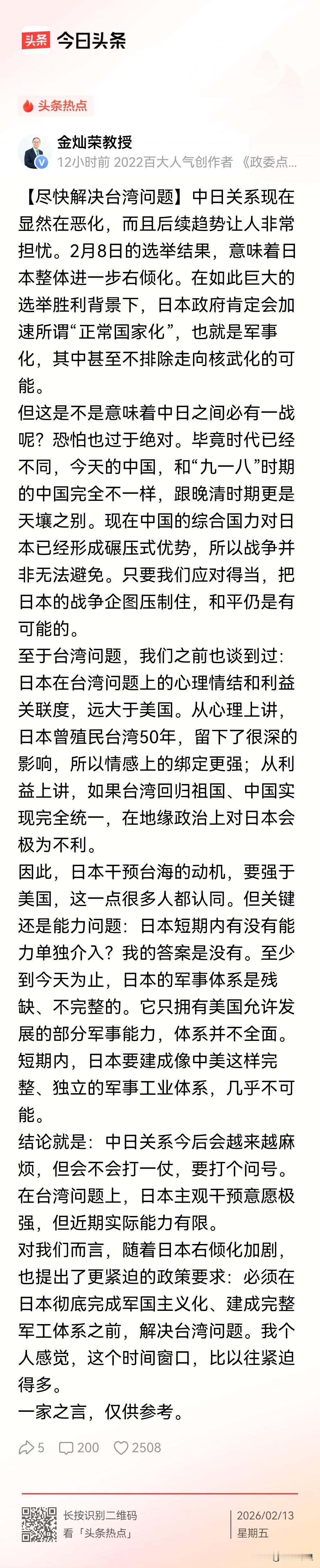 完全赞同支持金灿荣的观点! 尽快解决台湾问题 时不我待 越快越好