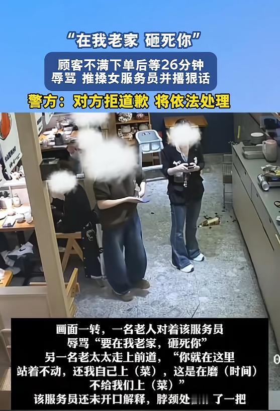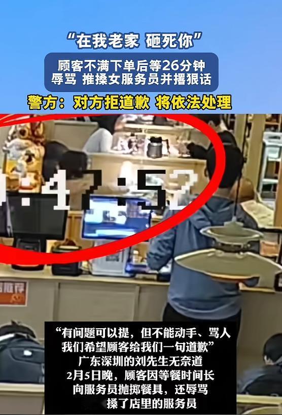 “太嚣张了!”一外地女子带家人到广东旅游,在一家餐馆吃饭时,女子一共点了10道菜,可26分钟过去了只上了6道菜,女子就朝服务员发火,还朝她投掷餐具,旁边老人更是撂下狠话“要是在我老家砸死你”!结果,民警赶来后,服务员一直在哭。 春节旅游正热闹的时候,广东一家餐馆里闹出了一件特别让人窝火的事,一个外地来的女游客带着家人出来玩,进店吃饭,一口气点了10个菜。结果等了差不多半个小时,桌上先后端来了 6 个,还有 4 个还在后厨做着。 说实话,节假日餐馆人多,出菜慢一点太常见了,很多人也就是催一催、问一问,基本都能理解。 可这名女子却完全没耐心,火气一下就上来了。 她直接站起来冲到服务员面前,大声嚷嚷,语气特别冲,完全不给人解释的机会,那名年轻女服务员赶紧赔笑脸,说现在是用餐高峰,后厨订单堆着,人手也紧张,正在抓紧做,希望稍微等等,可对方根本不听,越说越激动。 吵着吵着,她居然顺手抓起桌上的餐具就往服务员那边扔,餐具砸到旁边架子上,“哐”的一声特别响,周围吃饭的人都被吓一跳,纷纷看过来,现场气氛一下变得很紧张。 更离谱的是,跟她一起的一位老人不但没劝,还上前推搡服务员,嘴里还放狠话,说什么要是在他们老家,早就把人砸死了,说话又凶又冲,完全就是在威胁人。 那服务员本来就是个普通打工的小姑娘,哪见过这种阵仗,脸都吓白了,只能一边道歉一边往后退。 可她越退让,对方越不依不饶,继续骂,继续闹,餐馆里的正常秩序都被搅得一团乱。 老板听到动静赶紧跑过来,好声好气解释,说节日期间确实忙不过来,请多包涵,还不停道歉,希望把事情压下来,但那一家人就是不松口,越说越激动,根本讲不通道理。 老板一看再这样下去员工可能受伤,店里生意也要被影响,只能报警。 民警很快到场,直接调监控,监控里从吵架到扔餐具,再到推人威胁,全都清清楚楚,证据摆在眼前,这家人还是态度很硬,没有一点愧疚的样子,更别说道歉了。 一直强忍着情绪的服务员,等事情处理时终于撑不住了,在民警和老板安慰下当场哭出来。 到了派出所更是委屈得停不下来,哭了好一阵,她只是按规矩工作,没有任何错,却平白被骂、被威胁,还差点被砸,谁遇到这种事都难受。 视频传到网上后,很多网友都替服务员抱不平,大家普遍觉得,等 26 分钟已经上了 6 个菜,真不算离谱。 就算不满意,也可以催菜、退菜、甚至换地方吃,动手扔东西、恐吓别人,那就不是维权,是闹事。 餐馆老板态度也很明确:不要赔钱,不私了,就要对方当面给服务员道歉,让员工有个说法。 警方也表示,这种行为已经不是普通纠纷,明显越过了正常维权的界线,涉嫌违法,后续会依法处理。 很多人看完都挺唏嘘的,出来旅游,本来是图开心,结果把情绪全撒在打工人身上,餐饮行业本来就辛苦,节假日更是忙到脚不沾地,多等一会儿真的不是什么大不了的事。 人与人之间,最起码的尊重还是要有的。再大的火气,也不能靠扔东西、骂人、威胁来发泄,服务员没有做错事,却承受了不该承受的委屈,这才是最让人心疼的地方。 说到底,出门在外,带上礼貌和耐心,比什么都重要,脾气一上头,伤的是别人,也毁的是自己。 对此你怎么看? 信源:大风新闻