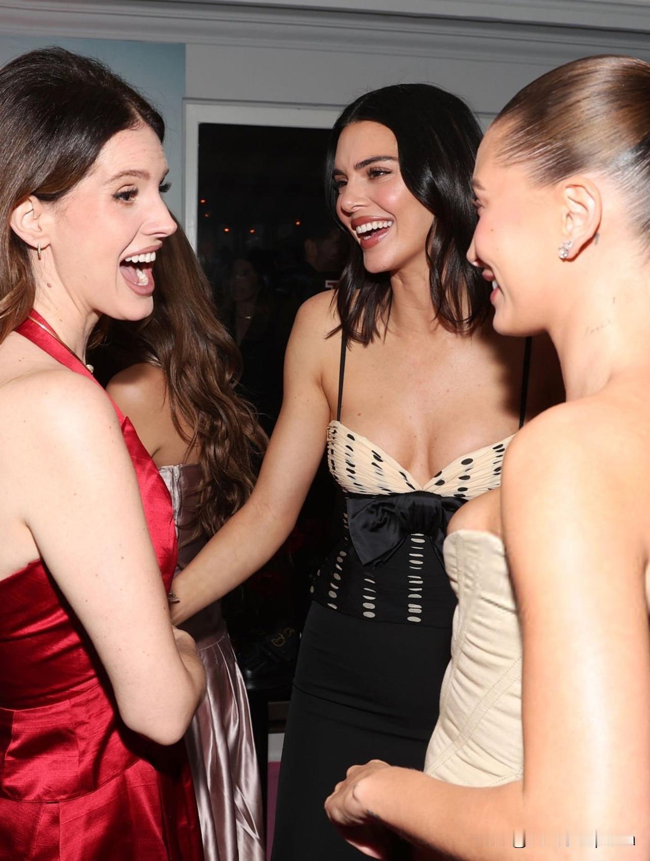 肯豆和海莉这对好闺蜜真是把“派对战袍”玩明白了! 她们都用紧身胸衣风的上衣搭配黑色下装,但呈现了两种截然不同的风格! 海莉选择了斯特拉·麦卡特尼的裸色无肩带紧身胸衣,搭配低腰阔腿西装裤,风格极简、干练,是她标志性的“酷感”路线。 肯豆身穿*华伦天奴的波点薄纱吊带,风格更具复古和“甜酷”感! 不过两人都是又高又瘦的好身材![赞]