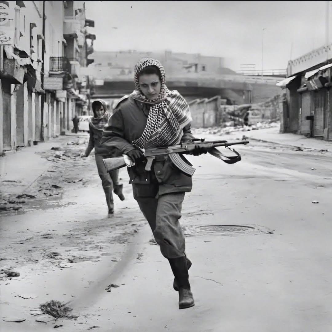 由凯瑟琳·勒罗伊拍摄于1976年的黑白照片,捕捉了两名身披阿拉伯头巾、手持AK-47步枪的巴勒斯坦女战士在黎巴嫩内战初期贝鲁特满目疮痍的街道上行进的场景。当时,巴解组织部队正与基督教民兵交战。当时这座城市还是一片开阔的战场。 这张照片凸显了巴勒斯坦妇女在抵抗运动中的积极作用,正如泰勒扎塔尔围城战等历史记载所表明的那样,妇女们组织救援并与男性并肩作战,这反映了自1969年以来巴勒斯坦妇女总联盟的动员。 在中东局势持续紧张之际,这张照片引发了人们对当前加沙冲突的联想,并获得了众多支持,这些回复肯定了妇女在巴勒斯坦解放斗争中始终如一的“步枪和尊严”。