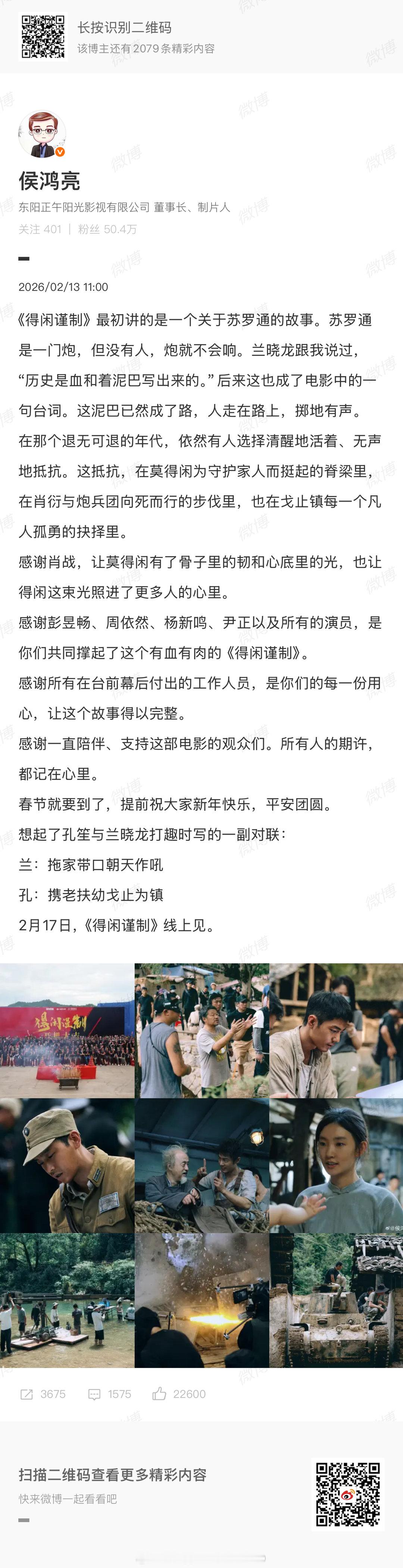 肖战得闲谨制网播定档2月17日腾讯视频播出,侯鸿亮发文感谢肖战“让莫得闲有了骨子里的韧和心底里的光,也让得闲这束光照进了更多人的心里”又可以在线上重复刷了!!