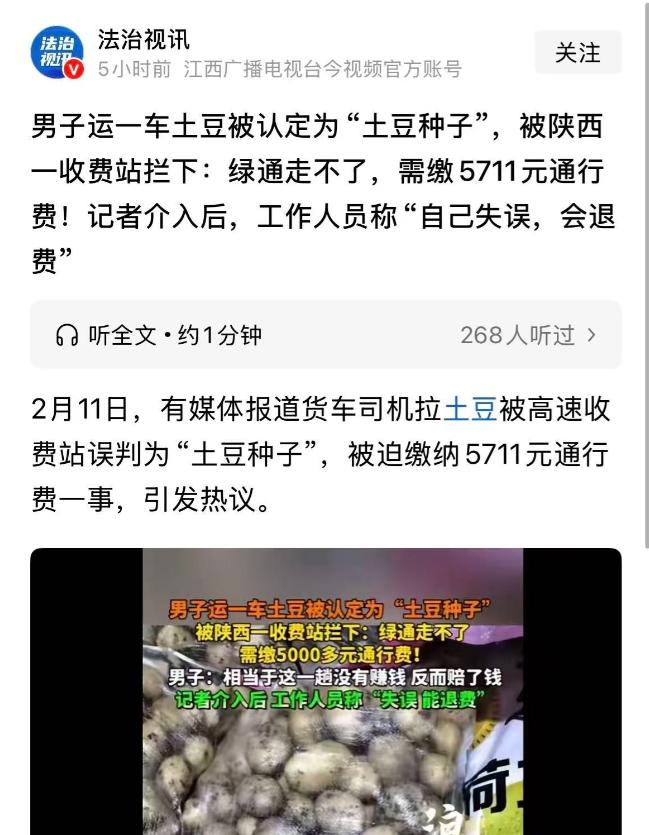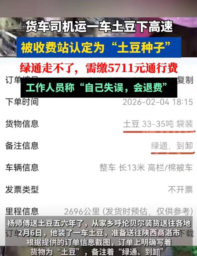 一车食用土豆,结果被当成“种子”被拦高收费,司机怒了:绿通咋还能凭肉眼说了算?5711元高速费,报警也拦不住,最后真相反转,收费站认错退钱……但这口气,真就咽得下? 杨师傅今年48岁,是内蒙古一名跑了十多年长途的大车司机。2月初,他从当地拉了一车“往商洛送的食用土豆”,整整35吨,装得满满当当,跑的是典型的绿通货。他说,运单上写得很清楚:品名是“食用土豆”。这种货物本来就属于鲜活农产品国家政策扶持范围,走高速公路可以免费通行,他也一早规划了绿通路线。 2月8日上午,当他驾驶货车准备从商洛某高速收费站驶出时,却被工作人员拦住检查。工作人员掀开篷布看了几眼,又检查了包装,随后一句话让杨师傅惊住了:“你这不是普通土豆,这是种子,不符合绿色通道的减免政策,得交费。” “啥?你凭啥说是种子?我们这是直接供应给饭店和农贸市场的,放锅里就能炒,咋就成了种子?”杨师傅抱怨说,货单在手、购销合同也写明是“用于食用”,以往他拉这种货几十回,哪一次不是直接通过? 可现场收费员仍坚持自己的认定标准,说是“根据包装、外观判断”,“你这个类型属于种薯,免不了费用”。 两边激辩半小时,杨师傅担心货品长时间停放会发热变质,交货时间也比较紧,就拨打了报警电话。 民警到现场了解情况,两边僵持之下也不好直接做出判定。出于负责任角度,民警建议他可以先交费,事后再通过正式渠道申诉退费,别因为这事耽误交货。 杨师傅一听更急了:“这不是多缴钱的问题,这是原则问题,凭什么你说是种子就得我掏钱?” 但为了避免后续经济损失扩大,杨师傅还是无奈缴纳了共计5711元的高速费。随后他把这一情况告知了商洛的收货方,希望能够部分分担这笔额外成本。没想到对方听完直接拒绝:“我订的是走绿通的货,标准运费早就谈好,交不交钱那是你司机的事。” 一趟下来,路费、柴油费、人工费全贴进去了,杨师傅不仅没赚,还倒亏几千元。他说得很直白:“跑这一趟,车可能都进维修厂了,这哪头划得来?” 更让他堵心的是——同一批货,同一个产地,同一品种,货主跟他透露,另一位司机几乎同时段,从商洛另一个高速口下车,人家就顺利走了免费绿通,一分钱没交。 “这一车是种子,那一车就不是种子?同一种土豆换个出口待遇都变了?”杨师傅感到难以理解,“是不是绿通,不该靠收费员一句话说了算。” 就在他打算发起申诉的时候,2月10日,收费站方面主动联系杨师傅,并做出了解释。工作人员承认在现场判定时存在疏忽与失误,将食用土豆误判为种薯,不符合标准,决定全额退费并当面致歉。 虽然钱退回来了,但这场突如其来的插曲,让杨师傅和不少同行都心有余悸。有人直说:“这不是制度问题,是执行问题,一样的政策不同的解释,司机太被动了。” 从法律角度来看,这类由工作人员在执行公务过程中所造成的错误,属于履职行为失误。根据《中华人民共和国民法典》第一千一百九十一条:“工作人员在执行工作职责时造成他人损害的,应由其所在单位承担侵权责任。”也就是说,像杨师傅因为错误判断而多支付的相关费用、误工损失等,本就可以要求行政单位依法赔偿;单位承担责任后,也有权对存在故意或重大过失的个人工作人员追究追偿。 虽然这起事件以退费和平解决告终,但从风险角度看,司机如想维权,还需经历申诉、举证、走流程。在经济压力和时间成本之下,大多数人都会选择“自认倒霉”息事宁人,这才是最值得关注的部分。 更深的问题是,绿色通道政策设立的本意是为了减少农产品在运输流通环节中损耗时间与运营成本,保障农民、承运人、收货方等多个环节的利益。但如果政策的执行依赖主观看法,不少真正合规的货物就可能无从享受应有的优惠,不仅损害了承运人的正当收益,也间接增加整个农产品链条的成本。 尤其是像土豆这类既能吃又能种的农产品,判断到底属不属于“食用类”,不能只凭地图纸、肉眼经验,更需要细则标准和数据支撑机制。 按照现行的绿通政策,货主或司机一旦能够提供合法的购销凭证,能够证明货物确系用于食用,应视为符合条件。若认定与实际用途不一致,举证责任则应由收费方来承担,而不能倒置证明责任。 杨师傅的遭遇虽已得到解决,但事件引发的质疑并没有结束。收费站口一线判断的那一刻,看似只是几秒钟的决定,却可能照进无数运输人的泪点。