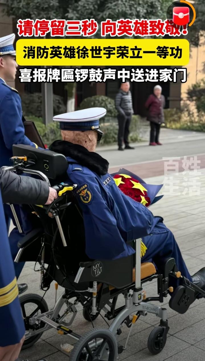 向英雄致敬,2月12日,四川都江堰,消防英雄徐世宇荣立一等功,喜报和牌匾在锣鼓声中送进家门,他肩披绶带,荣光加身,英雄那被灼伤的脸让人看着格外心疼。 荣光属于英雄,敬意献给勇士,他是人民的骄傲,是时代的楷模,致敬守护万家的消防英雄徐世宇。你的付出,我们永远铭记,向最可爱的人致敬!