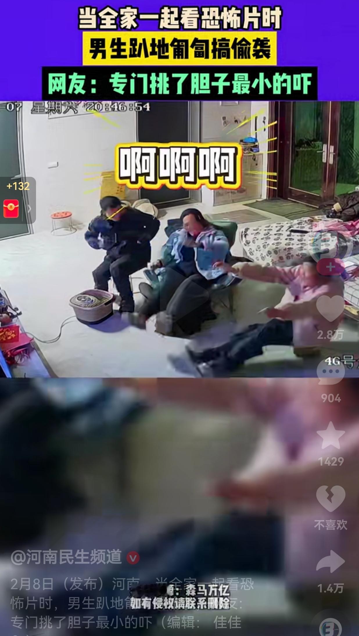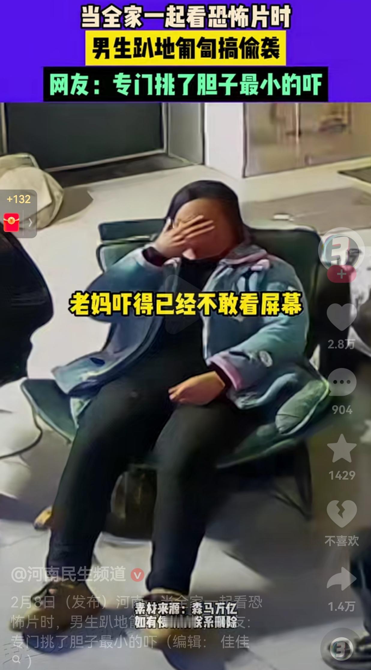 真不建议这样恶搞,人吓人真的吓死人!晚上,一家人吃过晚饭后,闲来无事,全家凑在一块儿看恐怖片,妈妈已经吓得用手捂着眼不敢看屏幕,妹妹则坐在小板凳上蜷缩在一起,看得出来很是害怕。而爸爸也紧绷着神经。 本以为这已经是够让人害怕的了!谁也没料到,真正的高能根本不在电视里,而在儿子这边。 视频中,儿子套着个假发套,像个“伏地魔”似的,悄咪咪地趴在地上,一点点往家人脚边爬,专挑胆子最小的妈妈下手。 就在妈妈刚要从指缝里偷瞄电视的瞬间,他“嗷”一嗓子扑了上去。 妈妈直接从椅子上弹了起来,尖叫着连滚带爬,妹妹也吓得一屁股坐在地上,连爸爸都被惊得一哆嗦,连盆带脚往后缩。 网友看到后评论说: “这孩子是懂恐怖片的,知道最吓人的永远在身后。” 也有的网友说: “妈妈那声尖叫,是刻在DNA里的恐惧,也是藏不住的爱。换我被我儿子这么吓,先揍一顿,再笑半小时。” 还有的网友说: “想起我家那小子,上次趁我看剧,从背后蒙我眼睛,我反手就是一巴掌,现在他还记仇呢。” 人吓人,真的能吓死人,这话真不是危言耸听。 你看这妈妈,从椅子上弹起来那一下,腿都软了。妹妹直接坐地上,半天缓不过神。就连平时稳如老狗的爸爸,都吓得连洗脚盆都差点翻了。这哪是“恶搞”啊,这是拿全家人的心脏开玩笑。 咱普通人的心脏,真没那么抗造。 尤其是家里有老人、有高血压、有心脏病的,这种“突然袭击”,真的可能直接把人送走。到时候,玩笑变成悲剧,哭都来不及。 不过,话又说回来,我也懂这孩子的心思。 他不是坏,就是闲得慌,想在全家看恐怖片的氛围里,当个“全场最佳”。他以为这是活跃气氛,是增进感情,可他忘了:爱和恶作剧,从来都不是一回事。 真正的亲近,不是把人吓个半死,而是在他害怕的时候,递上一杯热水。是在他紧张的时候,轻轻拍一拍他的肩膀。是在他需要的时候,安安静静地陪在他身边。 所以啊,真不建议这样恶搞。 日子可以过得热热闹闹,但不能过得心惊胆战。家人之间可以打打闹闹,但不能拿生命当儿戏。 毕竟,我们想要的,从来不是鸡飞狗跳的刺激,而是平平安安的踏实。 大家对此有什么看法呢?欢迎评论区唠唠。
