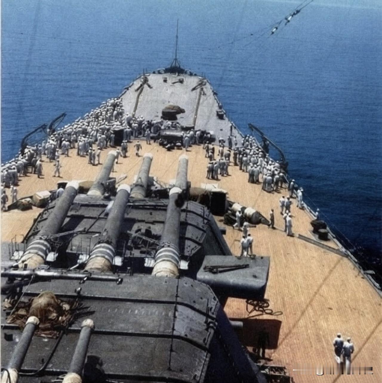 “武藏”号战列舰的前甲板。“武藏”号是日本海军“大和”级战列舰的二号舰,1938年3月在长崎造船厂开工建造,1942年8月服役,舰名源自古代武藏国。作为人类史上最大战列舰之一,其满载排水量超7.2万吨,主炮为9门460毫米巨炮(单弹1.5吨),舷侧主装甲带410毫米,被称作“不沉战舰”。 1943年2月,“武藏”号接替“大和”号成为联合舰队旗舰。1944年初,为应对愈发严重的航空威胁,它拆除部分155毫米副炮,加装大量25毫米防空机枪及对空雷达,进行了针对性防空改装。1944年10月24日,“武藏”号随栗田舰队参与莱特湾海战。在锡布延海,失去航空掩护的舰队遭美军航母舰载机多波次集中攻击。武藏号成为重点打击对象,累计被至少17枚炸弹、19枚鱼雷命中。损管抢救无效后,舰体严重左倾,当晚7时35分倾覆沉没,约2500名舰员中1021人阵亡。2015年,其残骸由保罗·艾伦团队在千米深海发现。 历史 历史老照片 二战 日本 战列舰 大和号