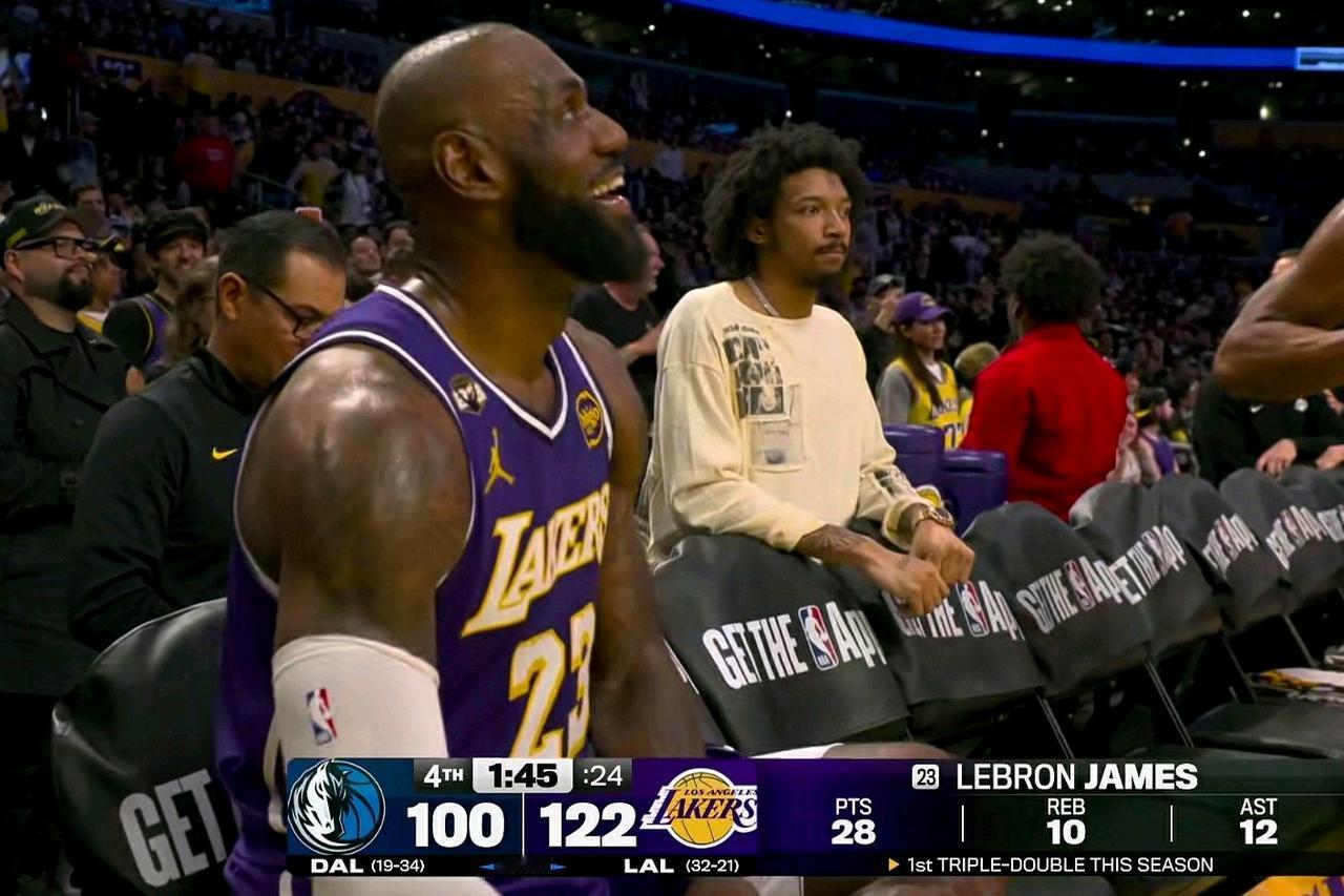 老詹不拿三双誓不罢休啊!在湖人主场大胜独行侠的末节比赛中:湖人末节大比分领先独行