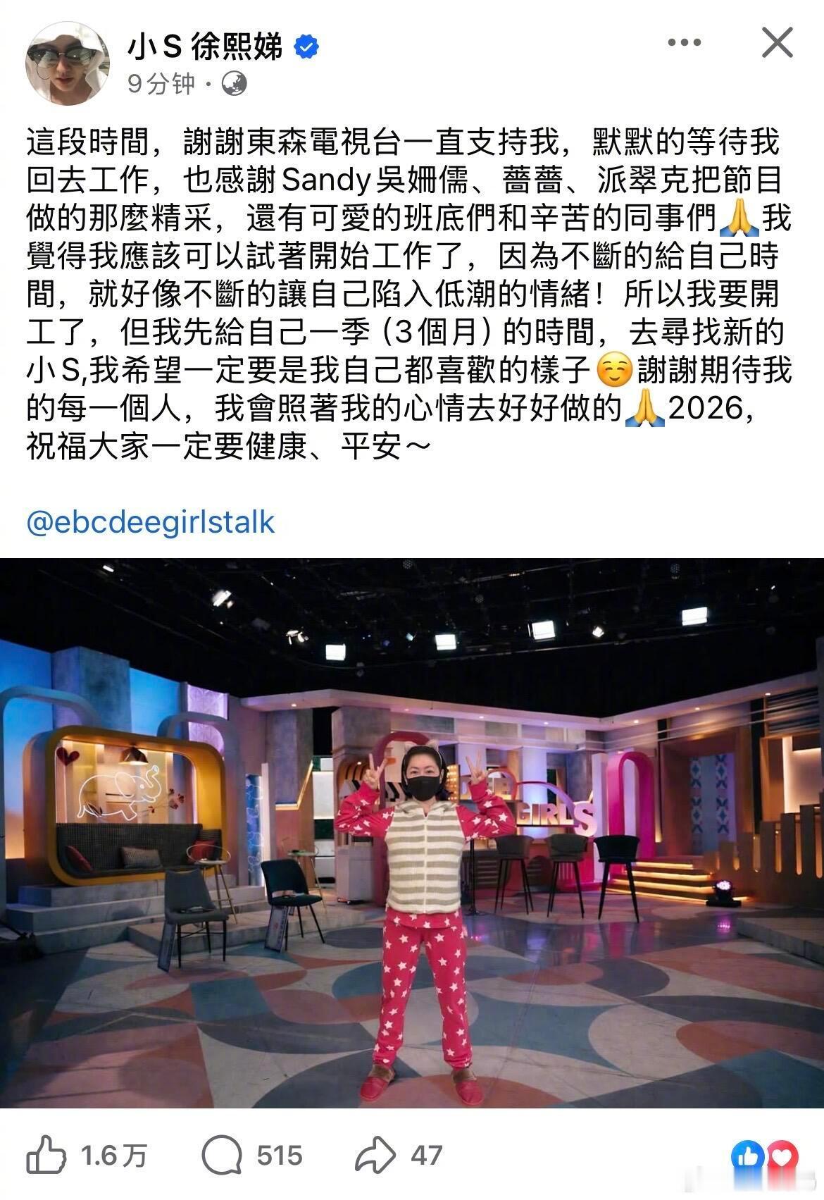 小S宣布复工,用3个月时间寻找新的小S,珊一定也会很欣慰🥺 小S晒开工照