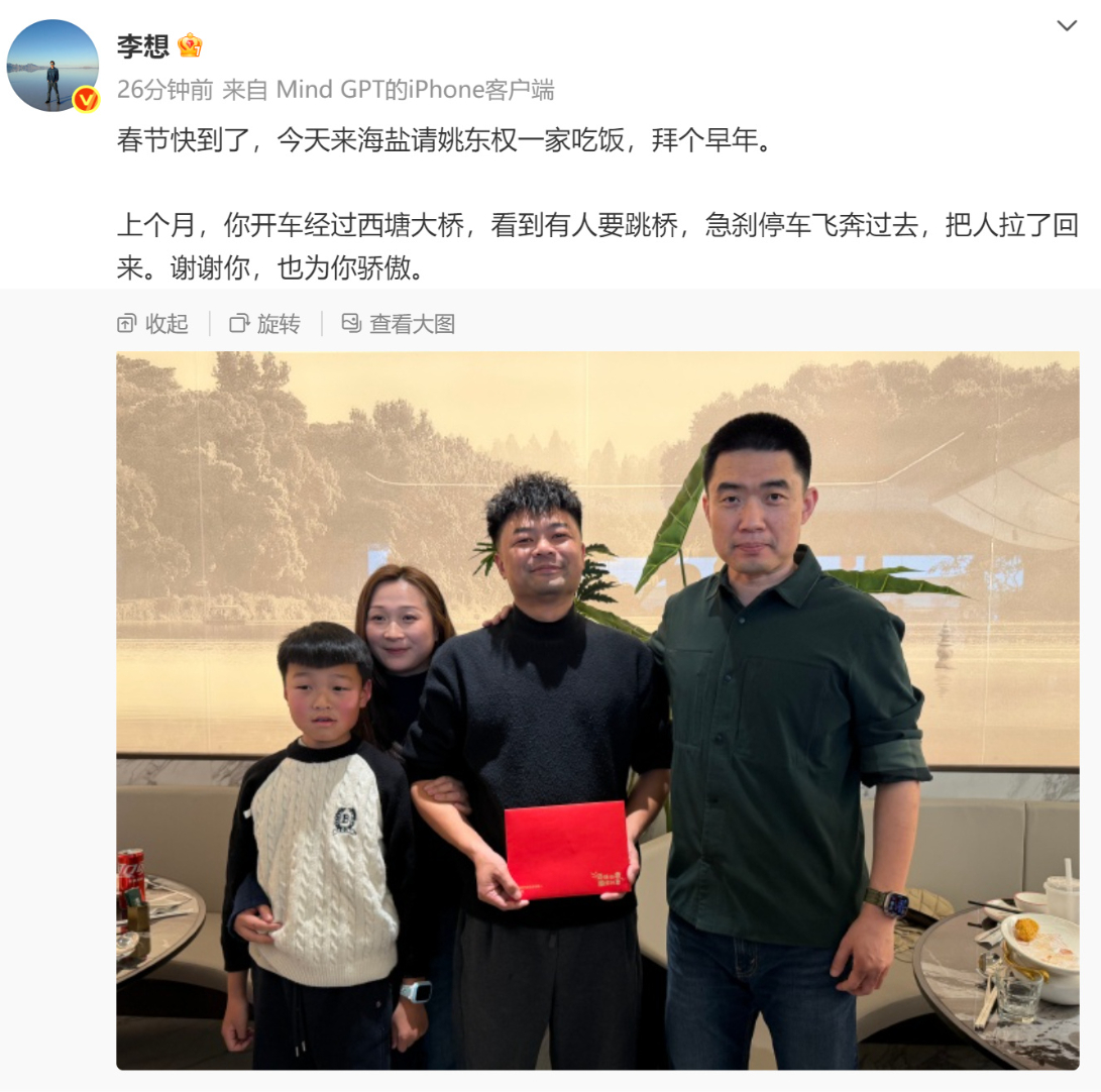 想哥到海盐请飞奔救人的理想车主吃饭了,并且赠送这位车主三年内免费置换任意理想车型的权益,这就叫好人有好报!