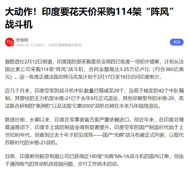 印度下血本!花360亿美元买114架战斗机,到底图啥? 据路透社2月12日报道,印度已经初步决定,从法国买114架“阵风”战斗机,花的钱特别多,足足360亿美元。 更巧的是,这个决定刚出来,法国总统马克龙就要在2月17日到19日访问印度,明眼人一看就知道,这就是印度给法国的“见面礼”,想跟法国搞好关系。 有人肯定要问,360亿美元可不是小数目,印度为啥非要花这么多钱买战斗机?其实原因很简单,印度空军的战机不够用了,缺口大到不得不急着补。 最近这几个月,印度空军能随时待命的战斗机中队,只剩下29个了。按照他们自己的计划,本来得有42个中队才够用,一下子差了13个,算下来大概缺几百架战机。 这么大的缺口,不管是守边境,还是日常巡逻,印度空军都力不从心。 为啥会缺这么多?主要是印度的老战机一直在退役,新战机却跟不上。印度以前的主力战机是米格-21,去年9月份已经全部退役了,这款战机用了很多年,经常出故障,退役也是没办法的事。 除此之外,还有米格-29、“美洲豹”、“幻影2000”这些老战机,也都用了几十年,零件不好找、维修麻烦,性能也跟不上,未来几年也会陆续退役。 老战机一批批退,新战机又没有,印度只能急着花钱买。那有人又问,印度不能自己造吗? 其实他们也想自己造,有一款国产战机叫“光辉”,但这款战机太不靠谱,根本指望不上。 这款“光辉”战机,印度从上个世纪80年代就开始搞,快40年了还没搞好,每年只能造两三架,而且发动机还得靠美国供应,经常没法按时交货,甚至出现过交8架战机、6架没发动机的情况,根本没法用。 质量也不行,还出过坠毁、漏油的事,印度自己说漏油是冷凝水,没人真信。 国产战机靠不住,印度只能从外国买,可放眼全球,他们能选的也不多。美国的战机虽先进,但附加条件多,印度不敢买。 俄罗斯的战机实战不行,产量也不够;欧洲的战机交货没保障。这么一圈下来,只有法国的“阵风”最合心意。 其实印度之前已经从法国买过36架“阵风”,2024年就全部收到了,用着也顺手,再买同款,飞行员不用重新培训,也能省不少事。而且法国不随便制裁印度,这也是印度选它的重要原因。 可能有人会疑惑,就算选“阵风”,也不用这么贵吧?其实这笔钱不只是买战机,还包括武器、维修、飞行员培训,再加上印度军购一直有回扣的猫腻,价格自然就高了。 另外,之前印巴空战,“阵风”被击落过,印度这次高调再买,也是想挽回面子。 不过大家别以为,印度买了这些战机,空军实力就真能大涨。短期来看,确实能缓解缺口,拉近和法国的关系,但长期来看,根本解决不了问题。 这批战机要到2035年才能全部到货,到时候“阵风”可能已经落后了,而且法国不会给核心技术,印度还是没法自己造,反而会更依赖外国。 说到底,印度花天价买战机,就是无奈之举。老战机退役、国产战机不靠谱,只能靠买。 还想靠这笔买卖跟法国搞好关系、挽回面子。但国防实力不是靠买出来的,得靠自己造,这一点,恰恰是印度最缺的。