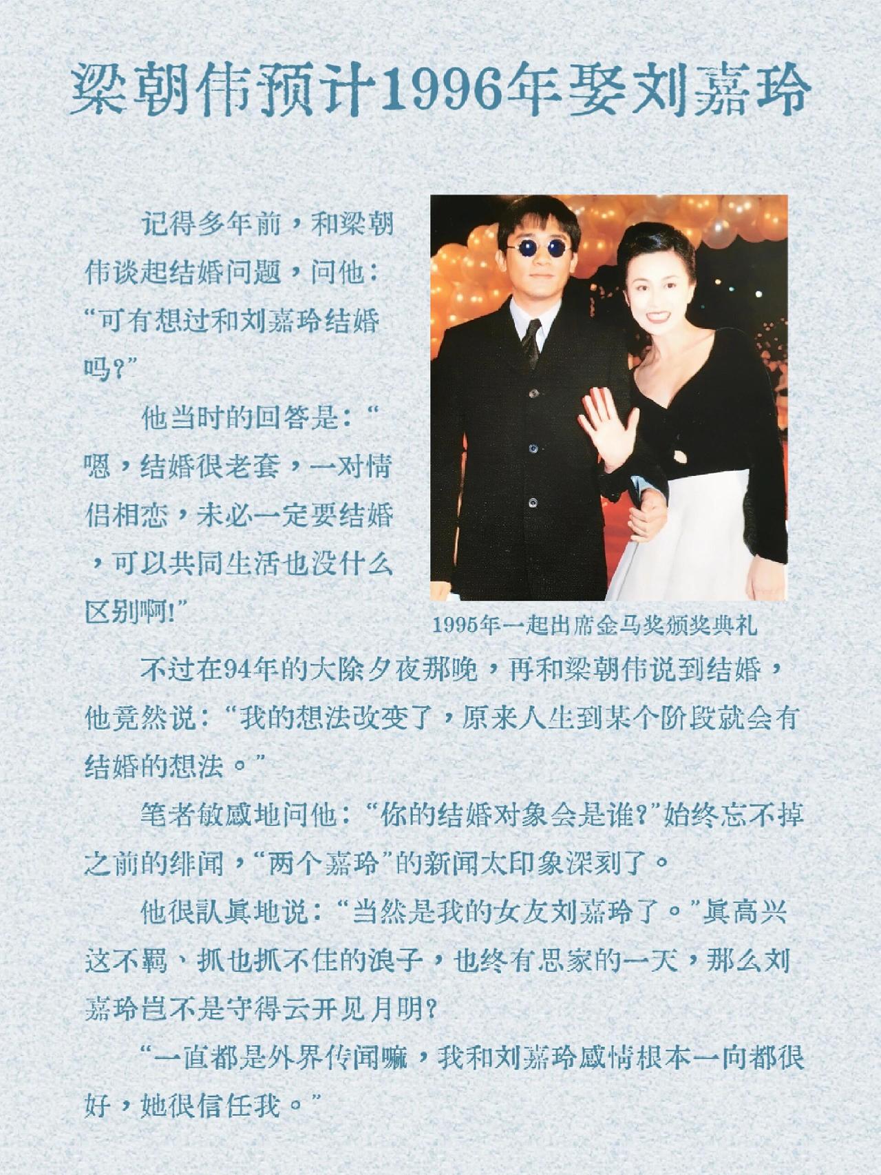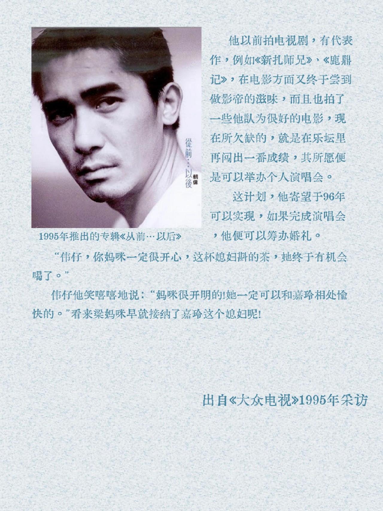 1995 年《大众电视》的这次采访太有意思了,当时“🐯”结婚愿望那叫一个强烈。在港星的黄金时代,很多明星的感情生活备受关注。就拿梁朝伟和刘嘉玲来说,他们的爱情长跑一直是大家津津乐道的话题。那个年代的采访就像一扇窗,让我们看到明星们最真实的一面。“🐯”在采访里展现出对婚姻的渴望,或许也反映了当时港星们在忙碌事业之余,内心对安稳家庭生活的向往。这也让我们感叹时光飞逝,如今再看这些老采访,仿佛穿越回了那个充满魅力的港星时代。