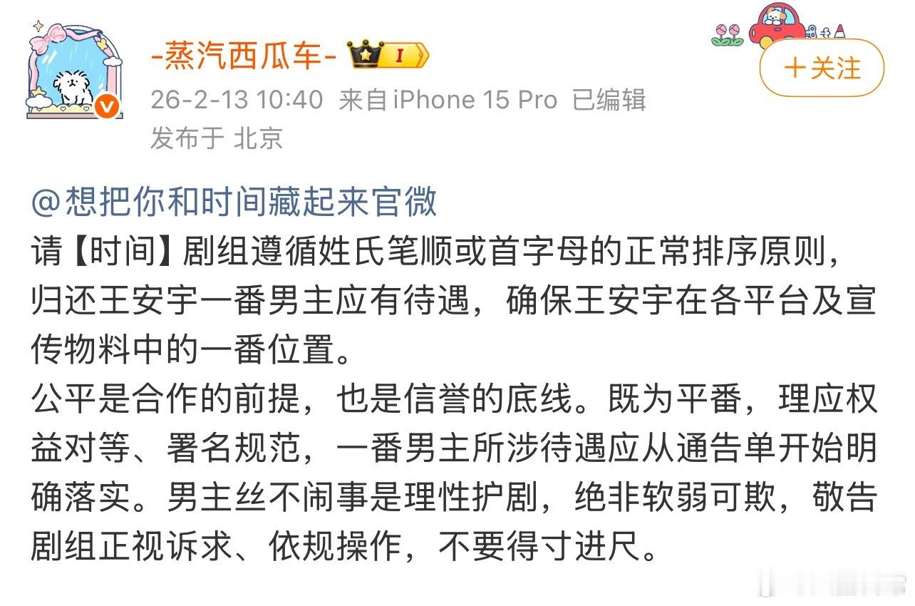 王安宇粉丝维权,要求《想把你和时间藏起来》剧组遵循姓氏笔顺或首字母的正常排序原则,归还王安宇一番男主应有待遇,确保王安宇在各平台及宣传物料中的一番位置
