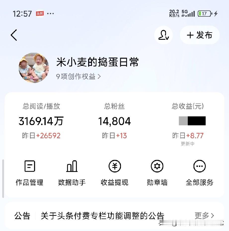 后台又炸了29.9万展现量 盯着这组数据,我突然笑了——我们总被“流量=收益”的谎言骗得团团转。30万推荐量听起来像个大新闻,可粉丝阅读才770,涨粉13个,连杯奶茶钱都不够。 做头条10个月,总播放3169万,总收益1万出头,平均下来每万播放才3块多。那些教你“日更3条月入过万”的课,全是收割焦虑的镰刀。 平台要的是“停留”,不是“路过”。与其追着流量跑,不如沉下心做内容。当你把“爆文”当成目标,就已经输了;当你把“读者”当成朋友,流量才会真正为你所用。 别再问“为什么我流量这么高却不赚钱”,先问问自己:你的内容,真的留住人了吗? 你在头条有没有过“流量爆了,收益却拉胯”的经历?评论区聊聊你的真实感受👇