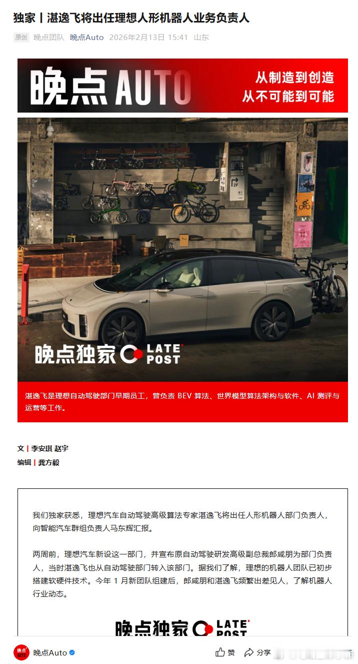 理想汽车自动驾驶高级算法专家湛逸飞将出任人形机器人业务负责人