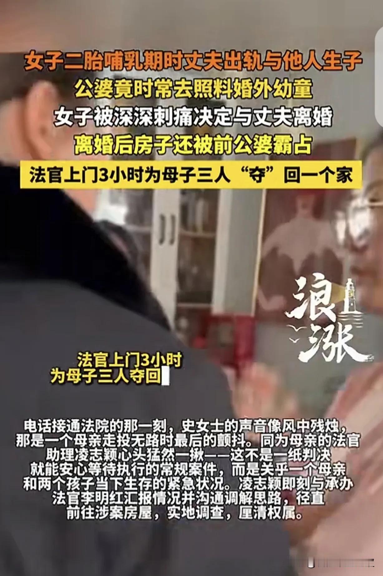 “上梁不正下梁歪!”北京,一女子2胎哺乳期,发现丈夫不但出轨,还跟第三者生了个儿子,让她火冒三丈的是,公婆还去照料那个私生子,真是家风不正呀,女子愤怒提出离婚,房子和2个孩子的抚养权都归女子所有,可不料,公婆却死皮赖脸住在房子里,说啥都不搬。女子崩溃了,给法院打去求助电话:我带着2个孩子,请帮帮我,我快撑不住了!结局大快人心。网友:短剧里才会出现的极品一家,原来现实中也有! 北京门头沟的冬天总是带着几分刺骨的寒意。2026年1月的一个傍晚,这种寒意穿透了史女士的骨缝。她站在自家门前,怀里抱着还在哺乳期的小女儿,腿边紧贴着惊慌失措的大女儿。手里那把熟悉的钥匙插进锁孔,却像插进了一块生铁转不动,分毫都转不动。 门锁被换了。这是一记无声却响亮的耳光。把母女三人挡在门外的,不是陌生的大盗,而是她的前公婆。尽管法院的判决书上白纸黑字写着这房子归史女士所有,但在那一刻,法律的尊严被两个老人的肉身死死挡在门后。 这不是一场突如其来的冲突,而是一场精心设计的“围猎”大戏的终局。回想几年前,婆婆的誓言还言犹在耳:“只要给俺家生个带把儿的,你就是大功臣,全家把你当皇后娘娘供着!”这套充满了封建霉味的“大饼”,曾是史女士咬牙坚持二胎的动力。 可现实给了她最荒诞的讽刺:她确实怀了二胎,就在她忍受孕吐、期待着家庭地位提升的同时,丈夫也没闲着。他在外面“彩旗飘飘”,那个第三者竟然也在同期怀孕。 命运开了一个残酷的玩笑史女士生的是女儿,而那个第三者,肚皮争气,生了个儿子。在这场“子宫竞赛”中,史女士输得彻底。 公婆的态度瞬间发生了化学反应般的逆转。之前承诺的“带娃”、“伺候月子”统统成了空头支票。老两口总是神神秘秘地“有事外出”,留史女士一人在屎尿屁中崩溃。 直到真相大白,史女士才感到脊背发凉:公婆所谓的“忙”,是忙着去照顾那个延续香火的私生孙子。 在这一家人扭曲的价值观里,婚内出轨不叫背叛,叫“开枝散叶”。私生子不叫丑闻,叫“光宗耀祖”。因为那个男孩的存在,丈夫的罪过被赦免了,甚至被默许了。 这种“上梁不正下梁歪”的腐臭味,终于逼得史女士清醒过来。她并未选择逆来顺受、忍气吞声,而是满腔愤懑地拿起法律武器,毅然决然地维护自身权益,以无畏之姿向不公亮剑。 或许是良知尚存的一瞬,又或许是自知理亏难逃法网,丈夫在离婚诉讼中放弃了抵抗。法院最终判决:两个女儿归史女士抚养,这套位于门头沟的房产也归史女士所有。 按理说,尘埃落定,各自安好。但前公婆却不干了。儿子的退让在他们眼里是软弱,他们决定用自己的方式“找补”回来。于是出现了开头那这一幕:换锁、拒不搬离、死皮赖脸地盘踞在已经不属于他们家的房子里。 他们的算盘打得很精:一个单亲妈妈带着两个幼女,能把两个老赖怎么样?难不成还能把老人扔在大街上? 这种“我老我有理”的流氓逻辑,在门头沟法院执行局的干警面前撞了墙。接到史女士近乎崩溃的求助电话后,执行法官没有丝毫拖泥带水,直接带队上门。面对紧闭的大门和屋内传出的胡搅蛮缠,一场长达3小时的攻坚战拉开了序幕。 起初,老两口故技重施,要么哭穷说没地方住,要么推脱说回老家的票还没买好,总之就是一个字:拖。 执行法官看穿了这种“僵尸占有”的把戏。他们没有陷入无休止的道德辩论,而是直接把《刑法》第三百一十三条摆上了台面——“拒不执行判决、裁定罪”。 “这不是民事纠纷,这是犯罪。如果今天不搬,等待你们的不是口头警告,而是刑事拘留。”这句话像一记重锤,砸碎了老人的侥幸心理。紧接着,法官又递过一个台阶:“如果今天立刻搬走,这两天的住宿费,我个人自掏腰包给你们补。” 一手是雷霆手段,一手是柔性执法。方才还气焰嚣张、扬言要“死在此处”的前公婆,刹那间便如被抽了气的皮球,气势全无,颓唐之态尽显。 他们灰溜溜地打包了行李。那一刻,他们不仅失去了房子的占有权,更彻底输掉了作为一个长辈最后的体面。 看着那两个佝偻着背影离开的老人,史女士没有胜利的狂喜,只有劫后余生的疲惫。她连夜找锁匠换回了新锁,把这几年的荒唐岁月彻底关在了门外。 此事留给旁观者的思索,远比那把锁来得沉郁。这思索似铅块坠心,其重量绝非锁具所能比拟,引人长久探寻其中深意。 那个被全家视若珍宝的私生子,在这样一种是非不分、视法律为儿戏的家庭环境中长大,未来将会如何?这恐怕是另一个悲剧的伏笔。 正如一位网友所言:“嫁人不仅是嫁给一个男人,更是嫁给一种家风。”史女士用了几年青春和一身伤痛,终于验证了这个惨痛的真理。 好在,法律最终没有让“无赖”成为赢家。那面送给法院的锦旗,不仅是谢意,更是一个母亲带着两个女儿重生路上的路标。