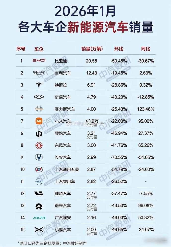 比亚迪20.5万守住了王座,但同比下滑30%、环比腰斩——基盘太大,淡季惯性也大。赛力斯同比暴增123%,小米、蔚来猛涨90%以上,三家把“高端新能源还能翻倍”这件事做实了。 另一边,长安、奇瑞、小鹏同比跌30%以上。不是车不好卖了,是去年1月太顺,今年1月太冷。 旺季看环比谁冲得猛,淡季看同比谁扛得住。这张榜,照的不是名次,是底色。