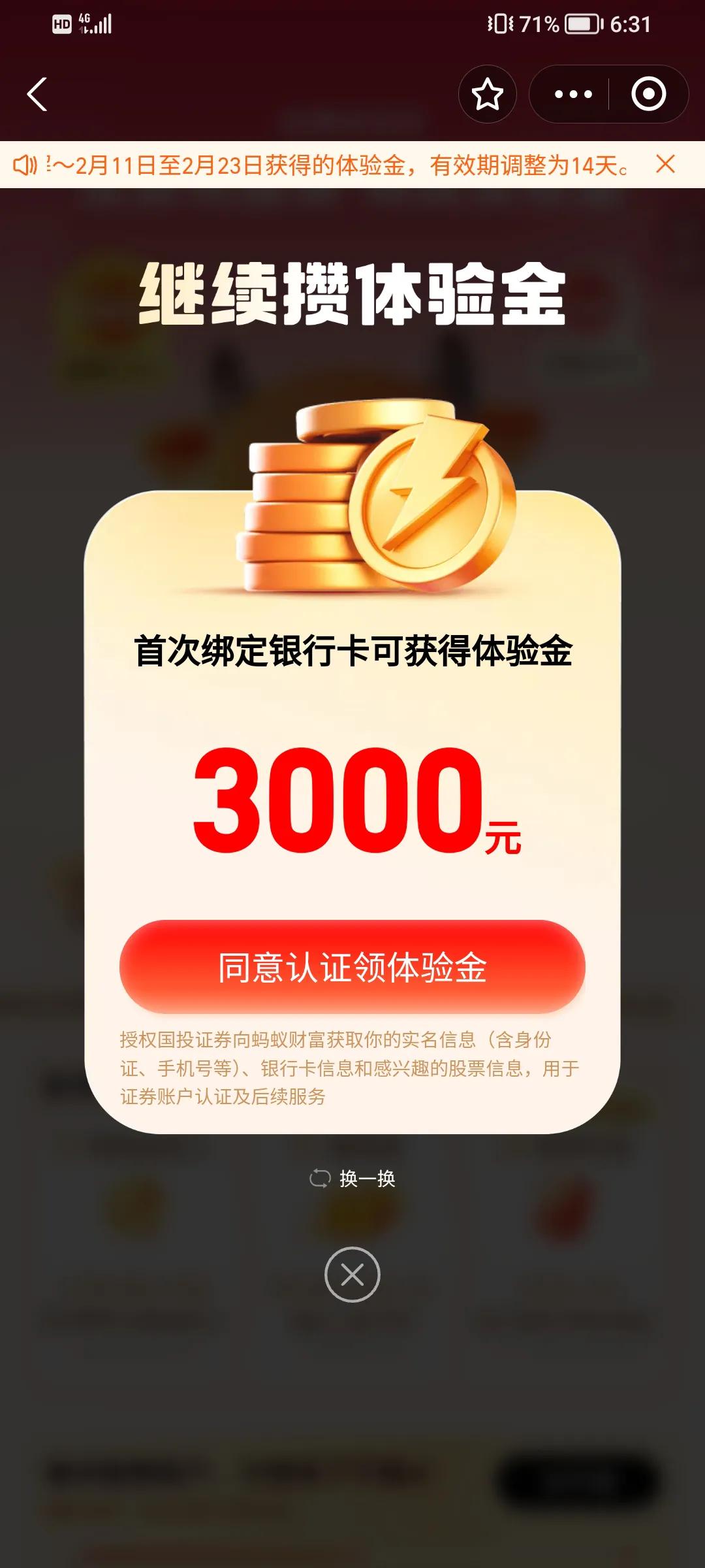 哪有什么天上掉馅饼,那只是痴人梦想,爷从来就不信这一套。今天在支付宝输入转债债基,在页面下赦然显示免费买三个醒目的大字,扑通的心加上颤抖的小手,单纯的我点了进去,页面上快跳转到了要绑定银行卡才可获得3000元体验金的对话框,面对这一幕,我感觉自己的智商瞬间被人调戏一般,我被气鼓鼓的,哪有什么天上掉馅饼的好事啊。