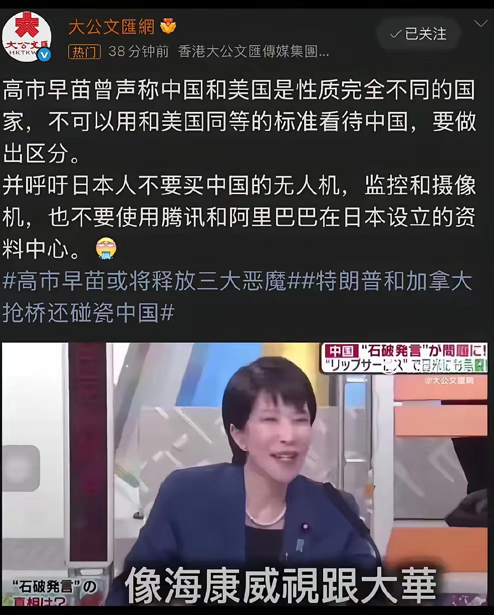 2月12日,大公报报道,高市早苗在参加一档电视节目中表示: “中国与美国是两个性质不同的国家,不可以用和美国同等的标准看待中国。她呼吁日本人不要购买中国无人机,不要用阿里巴巴与腾讯设立在日本的资料中心。” 有网友评论:其实也可以理解,她在用甜言蜜语哄着美国人,她知道如果得罪了美国,“小男孩”,“胖子”就到日本了。日本人最怕美国,也最恨美国。 我们认真务实做好自己的事,严格监视并随时准备好打击军国主义的日本! 对此,你怎么看?