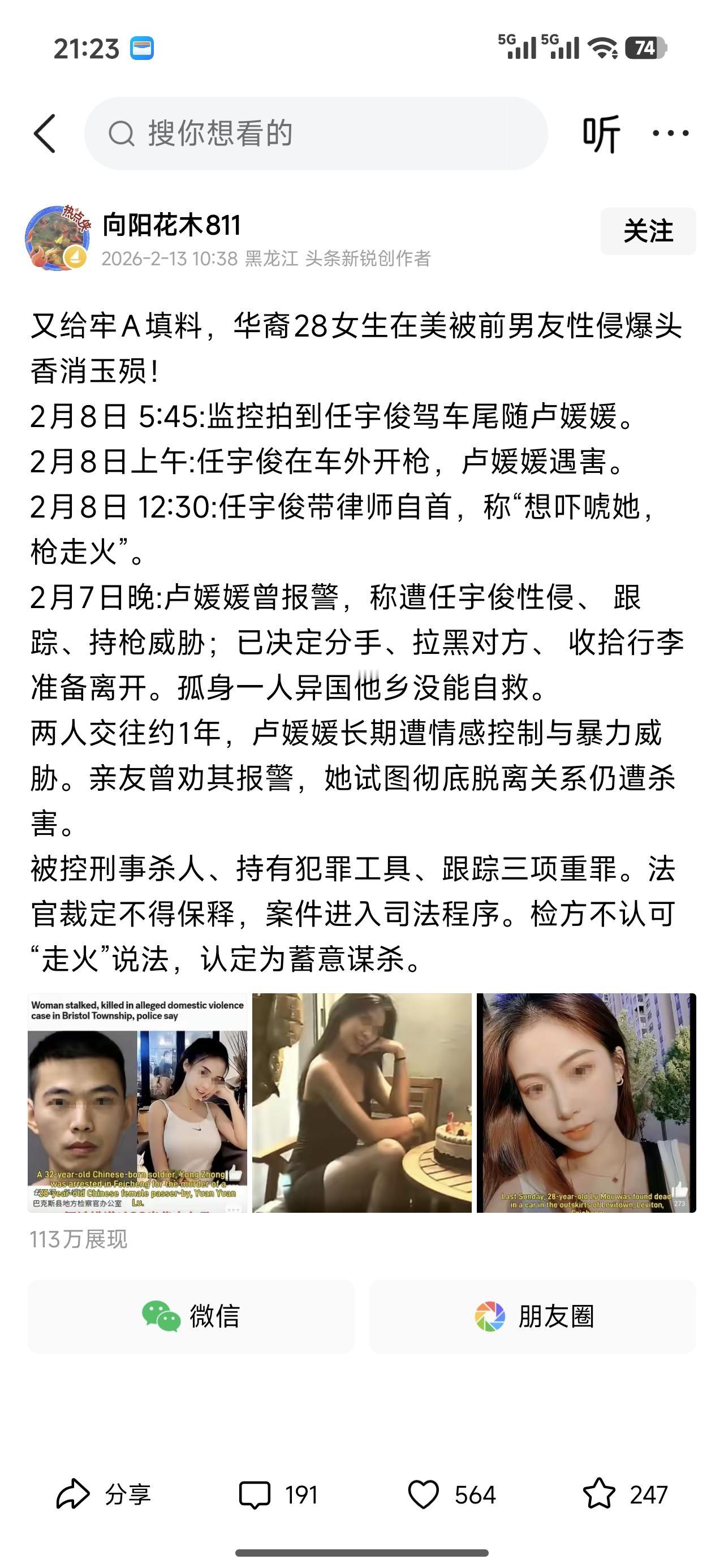 这么好看的女生,2.7已经知道自己有危险,报警,并收拾行李,准备离开。 两人交往一年,男方看面相是亚洲面孔。算了,姓任,也可能是个华人。 2.8号,就被前男友跟踪,说枪走火。杀害。 好端端的谈个恋爱,竟这般危险。你能想到了? 没事儿就在国内溜达溜达,想冷了去北方,想热点去男方,花钱少,还自在。这种事情的发生概率还是要低很多的。